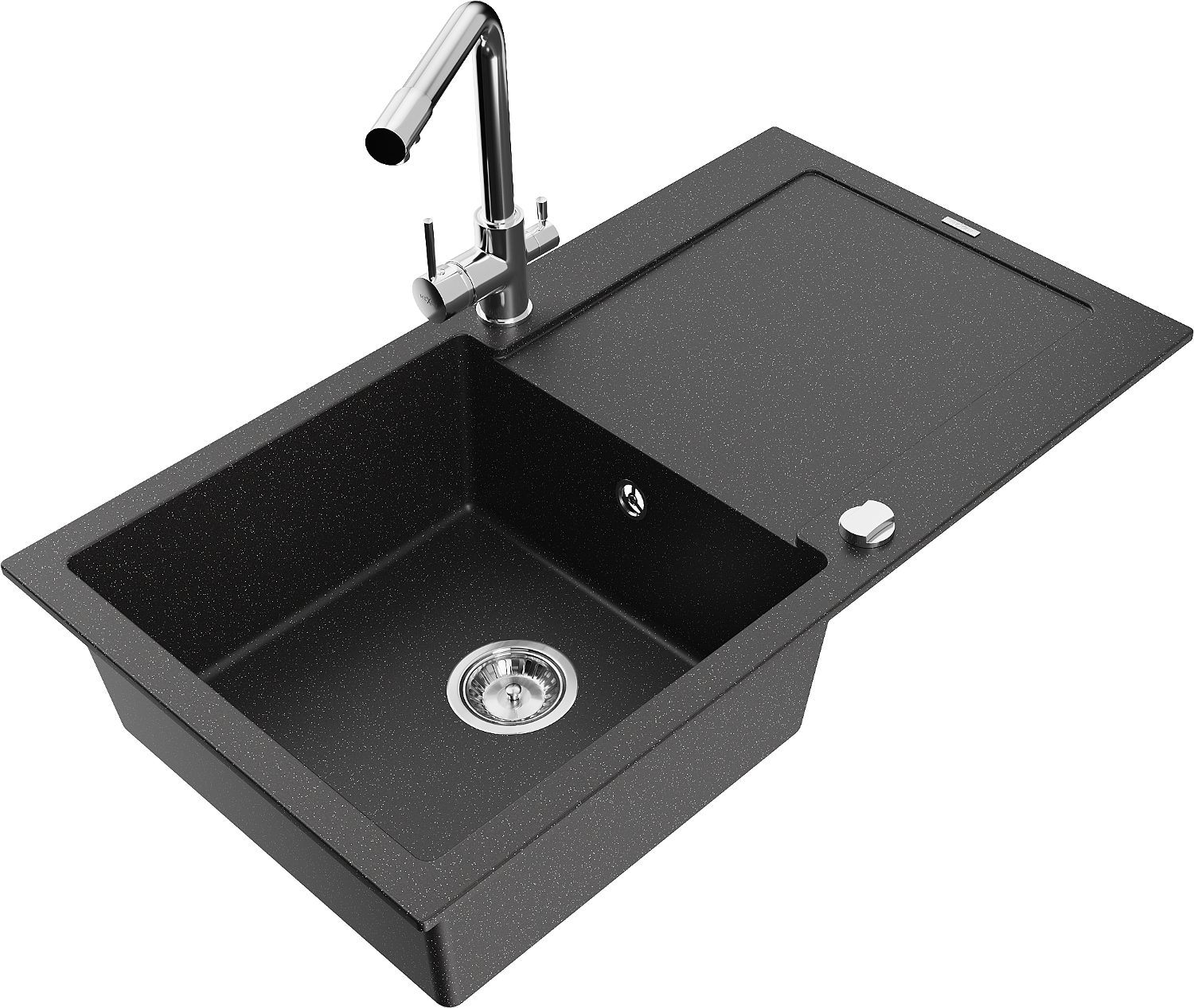 Mexen Leo granitový dřez 1-komorový s odkapávačem a kuchyňskou baterií Duero, černý/stříbrný metalik - 6501-73-671600-00