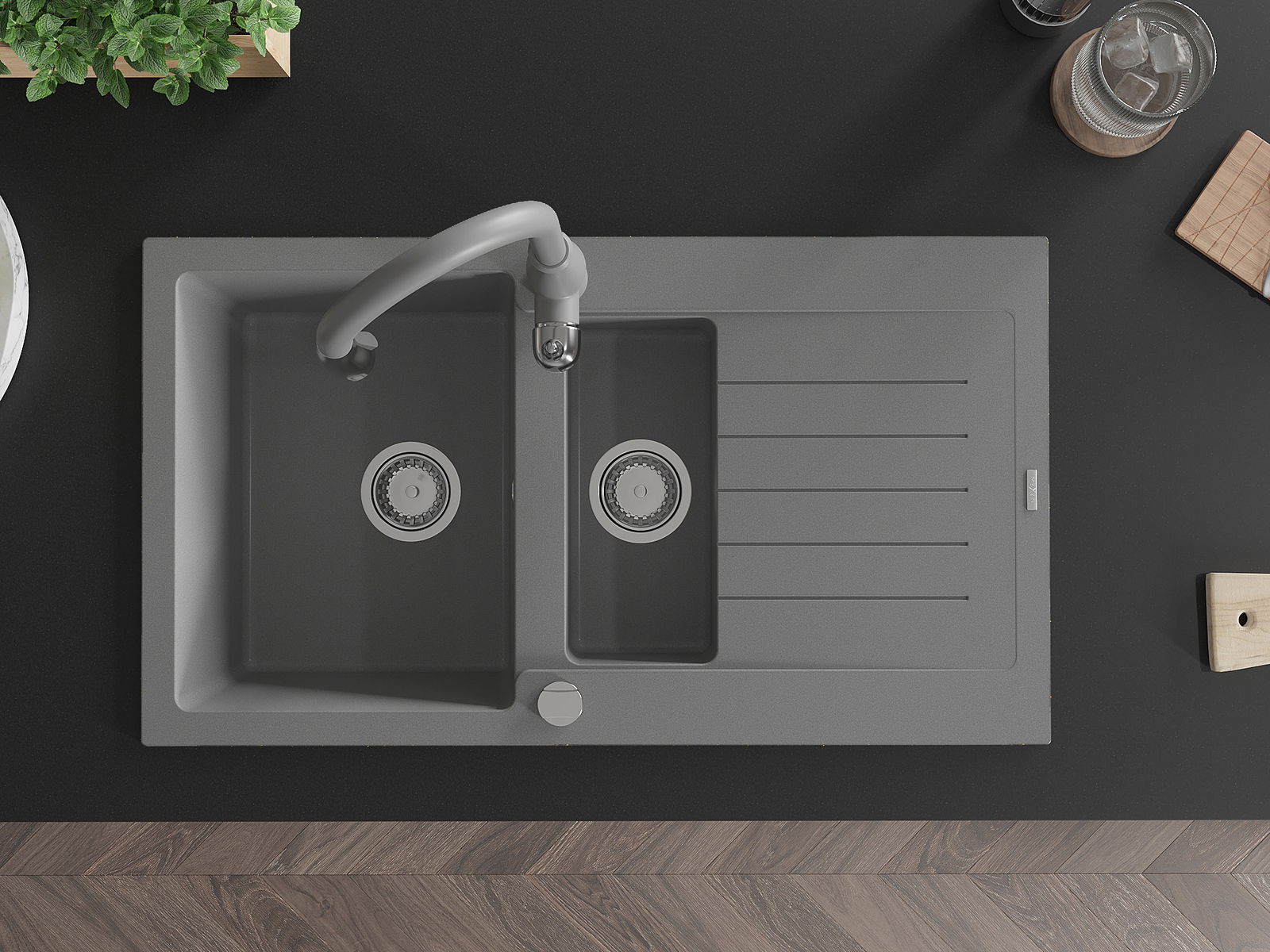 Mexen Matias dřez žulový 1,5-komorový s odkapávačem a kuchyňskou baterií Savita, šedý - 6502-71-672601-71