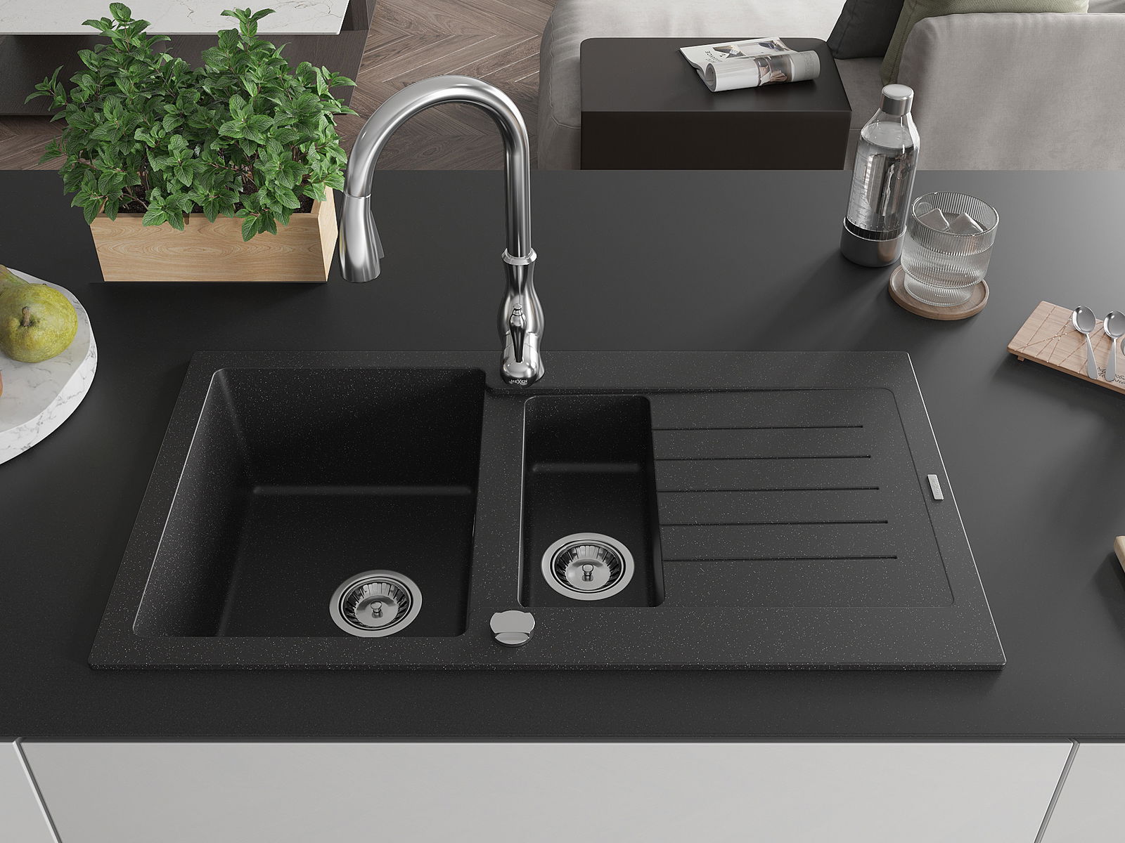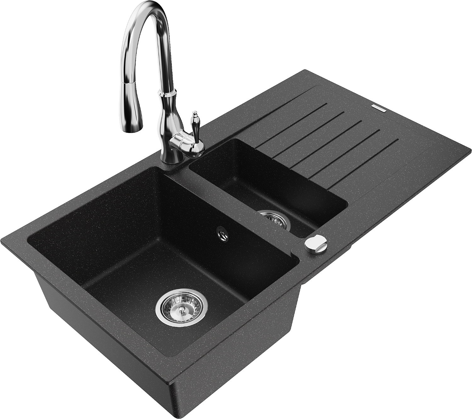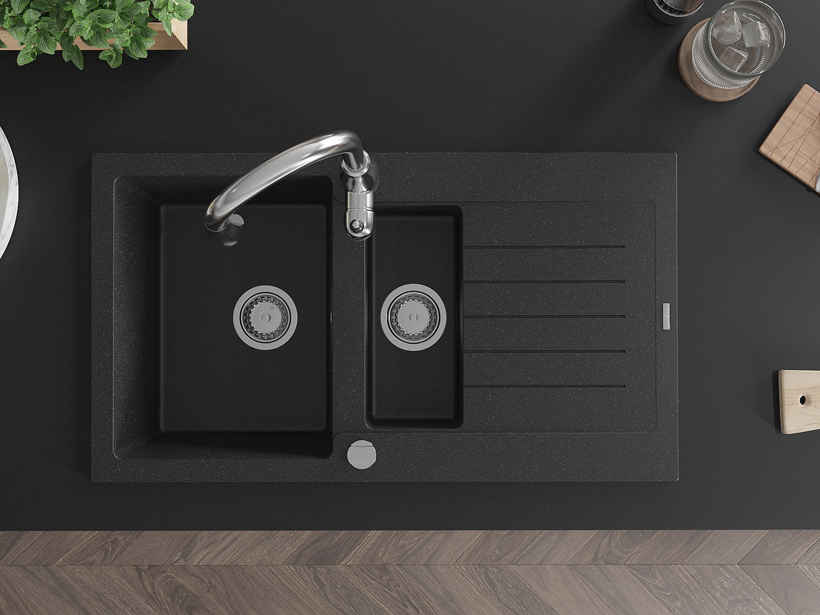 Mexen Matias granitový dřez 1,5-komorový s odkapávačem a kuchyňskou baterií Savita, černý/stříbrný - 6502-73-672601-00