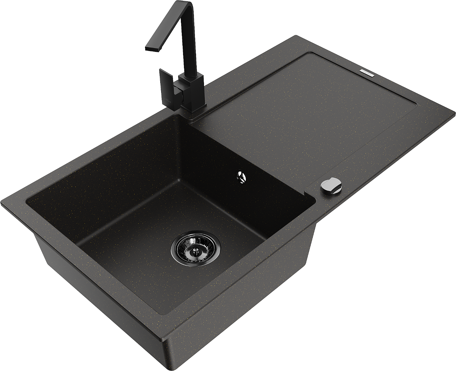 Mexen Leo granitový dřez 1-komorový s odkapávačem a kuchyňskou baterií Rita, černý/zlatý metalický - 6501-75-670300-70-B