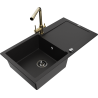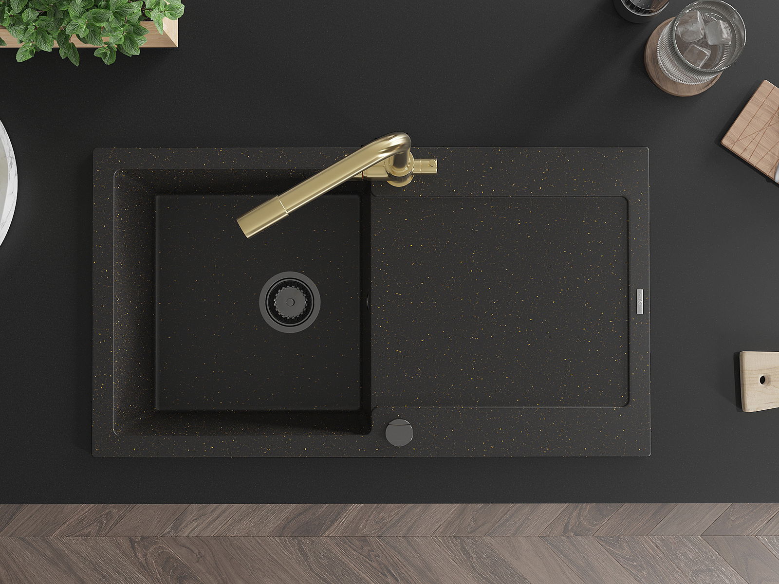 Mexen Leo jednokomorový žulový dřez s odkapávačem a kuchyňskou baterií Duero, černo/zlatý metalik - 6501-75-671600-50-B