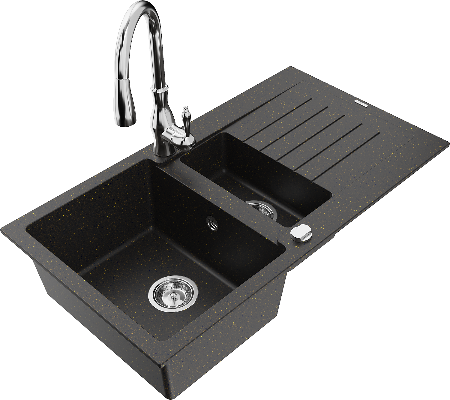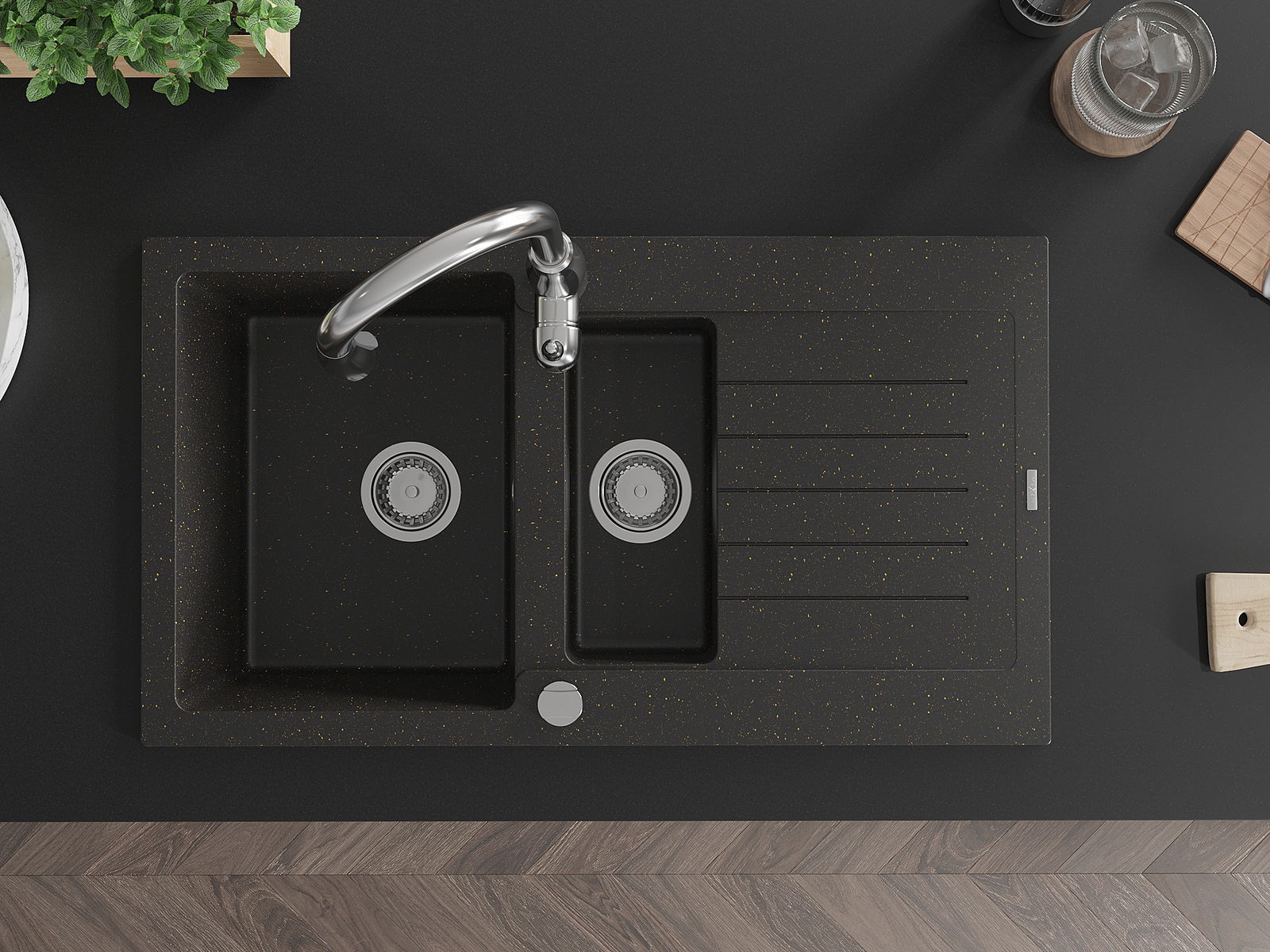 Mexen Matias granitový dřez 1,5-komorový s odkapávačem a kuchyňskou baterií Savita, černý/zlatý - 6502-75-672601-00
