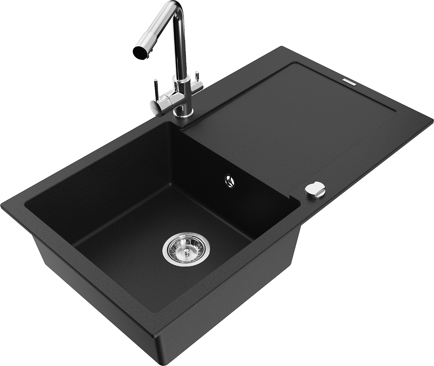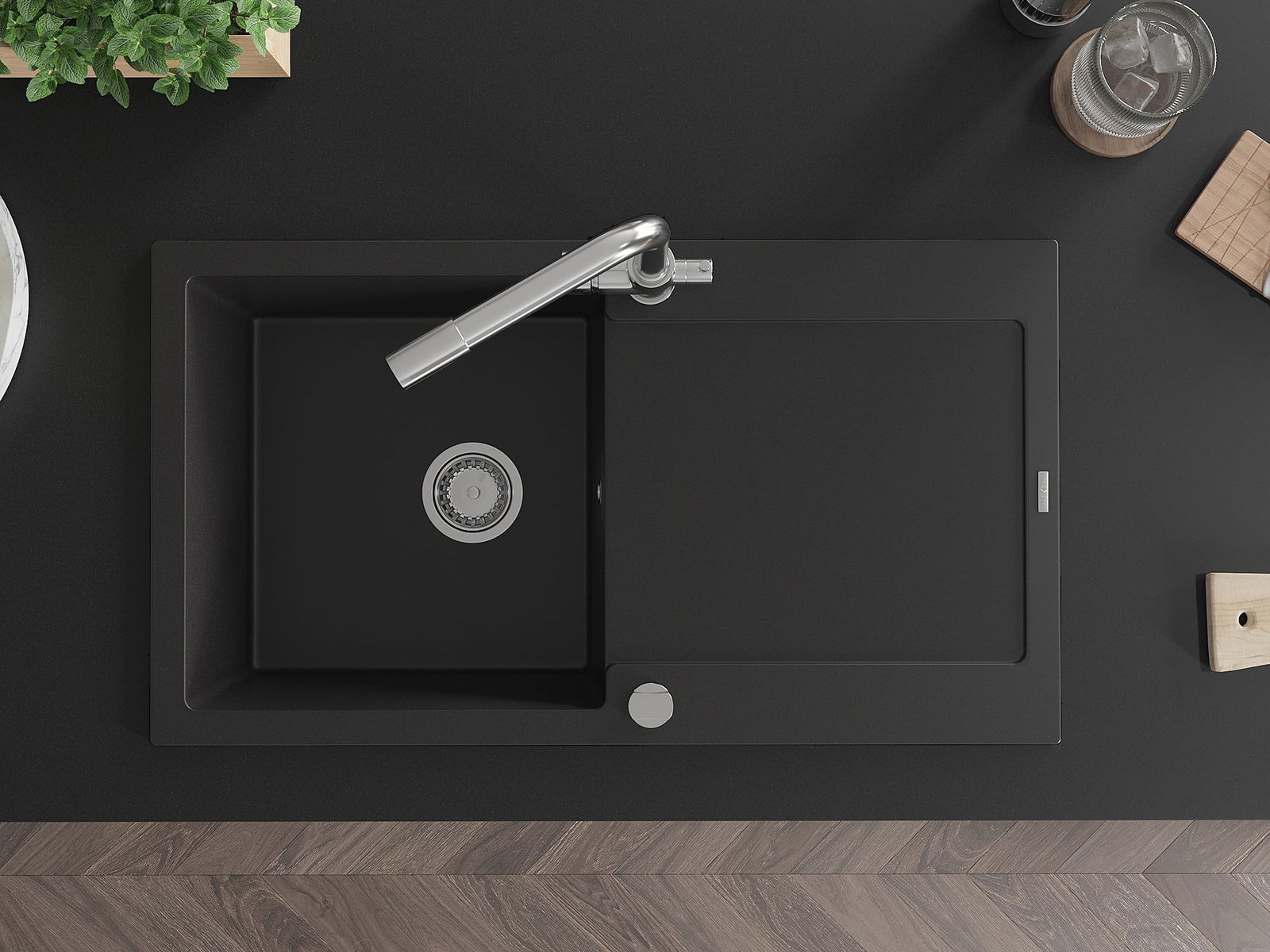 Mexen Leo granitový dřez 1-komorový s odkapávačem a kuchyňskou baterií Duero, černý - 6501-77-671600-00