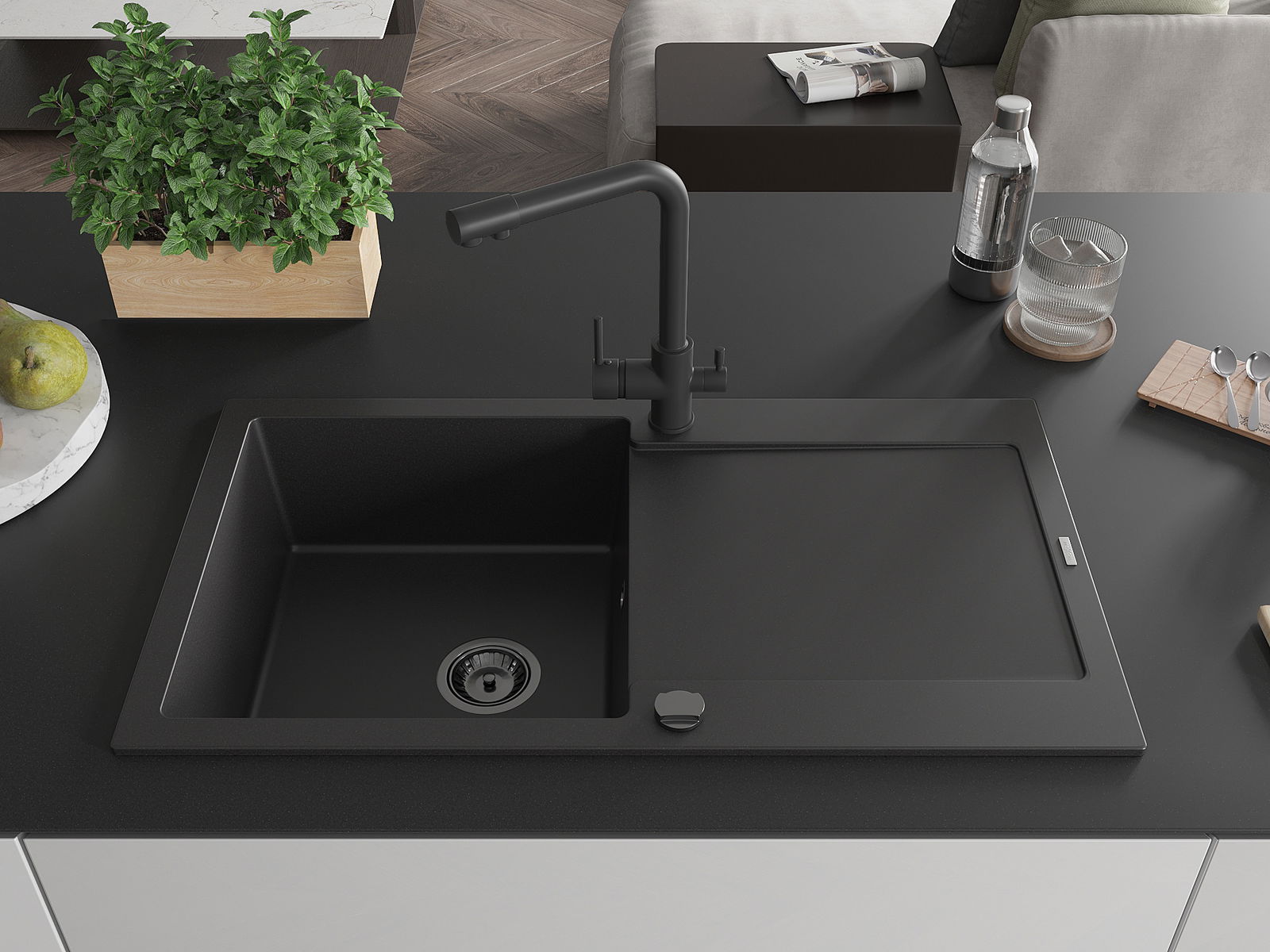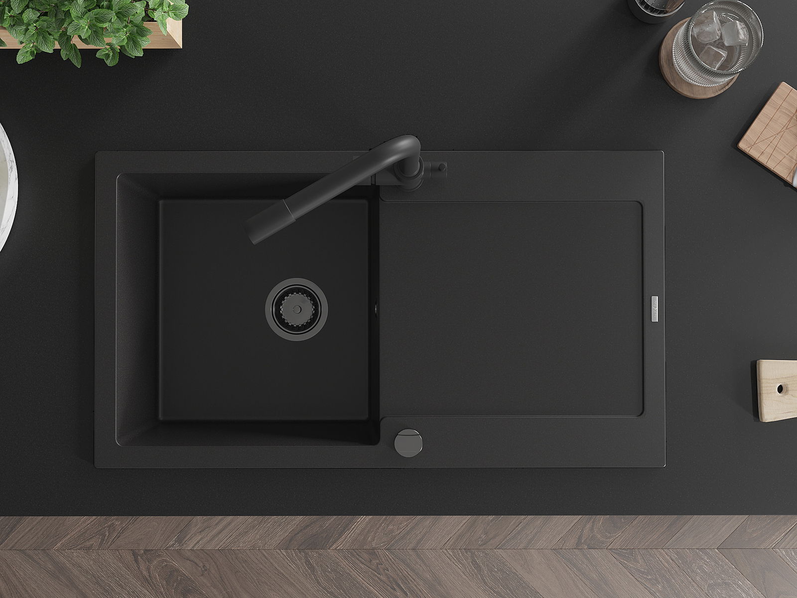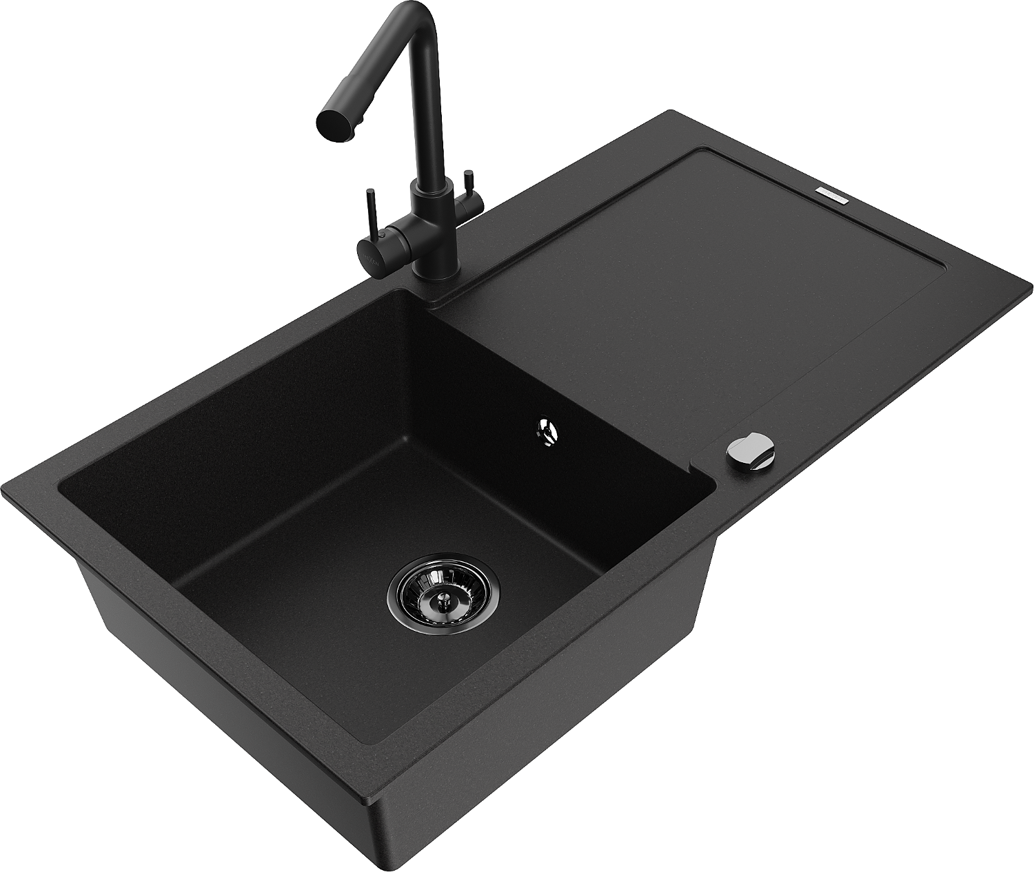 Mexen Leo granitový dřez 1-komorový s odkapávačem a kuchyňskou baterií Duero, černý - 6501-77-671600-70-B