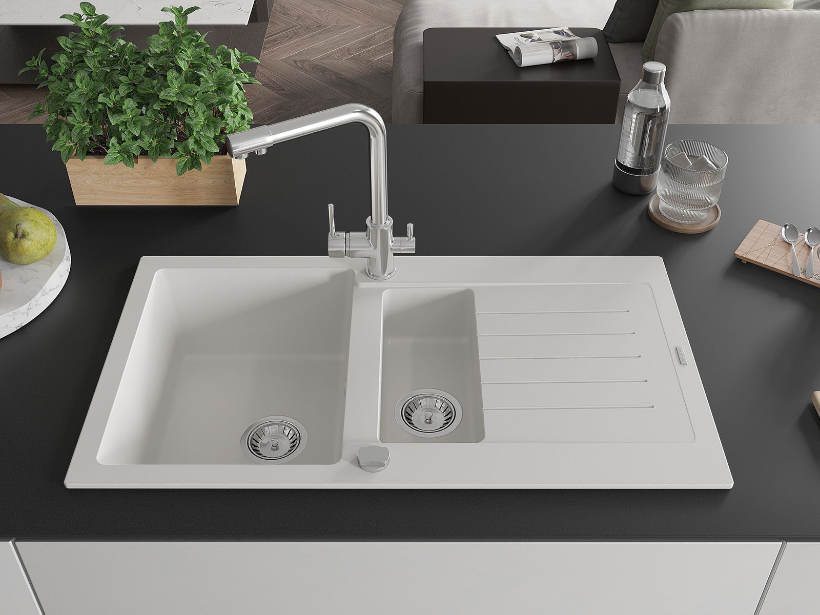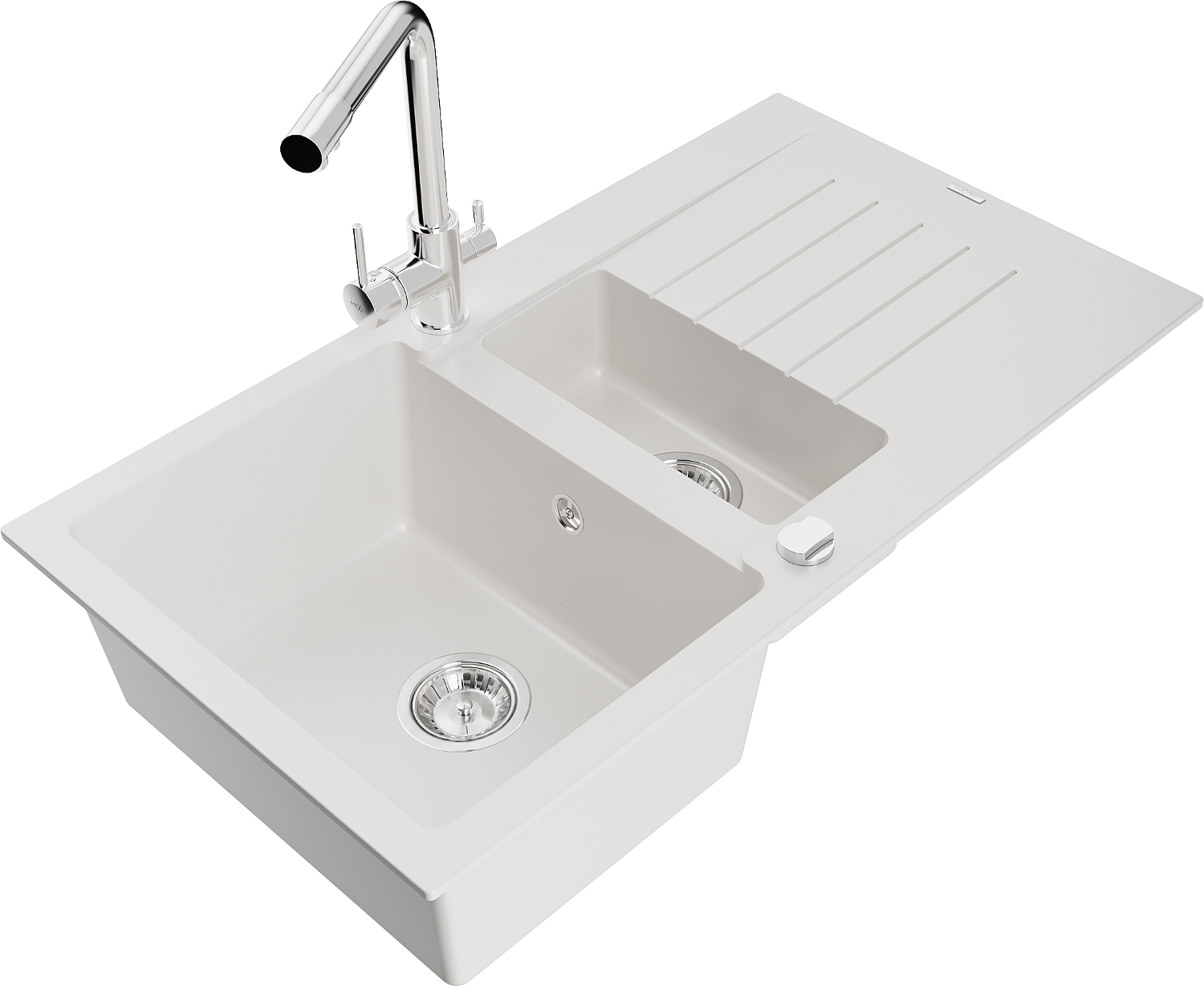 Mexen Matias dřez granitový 1,5-komorový s odkapávačem a kuchyňskou baterií Duero, bílý - 6502-20-671600-00