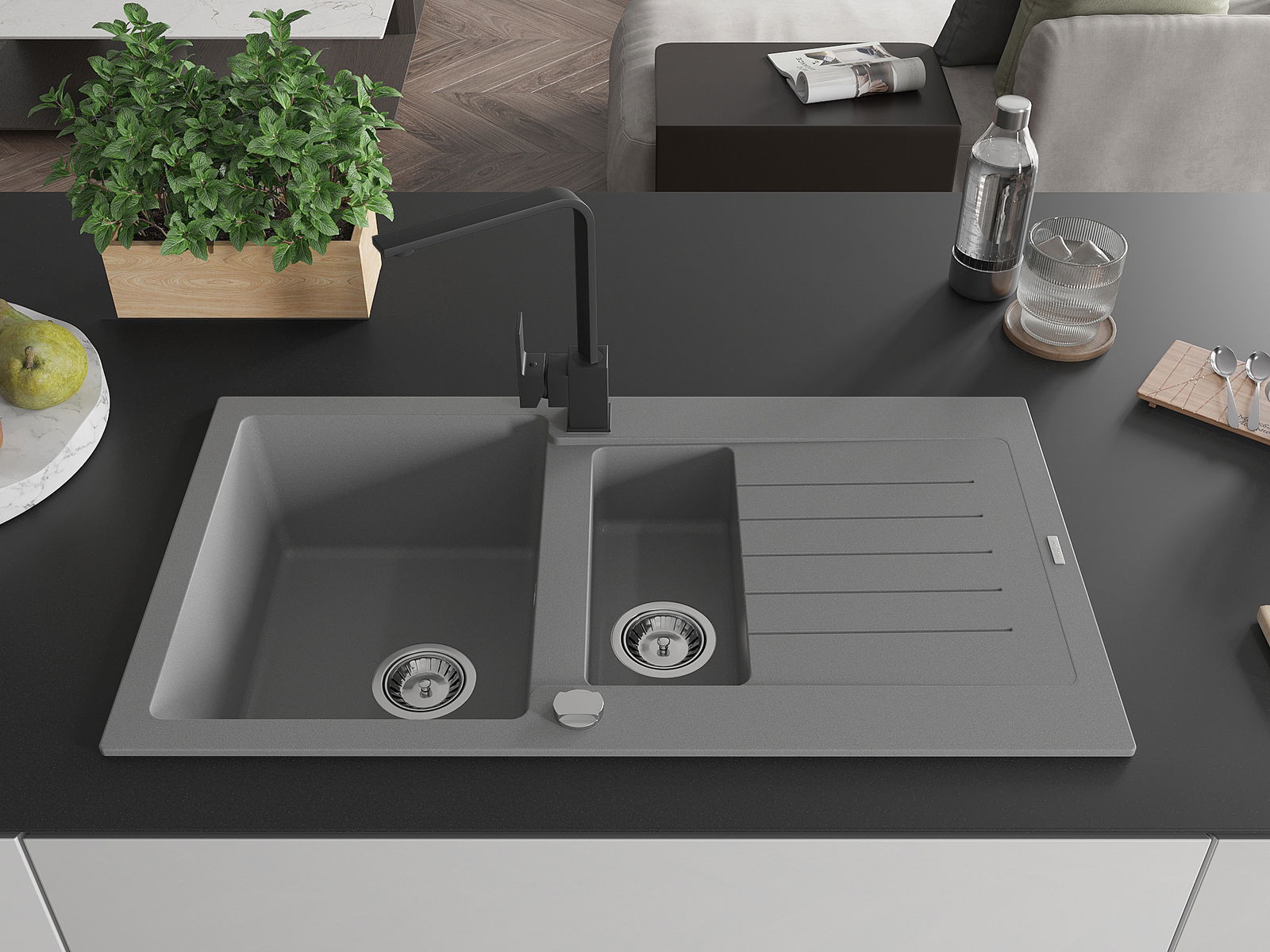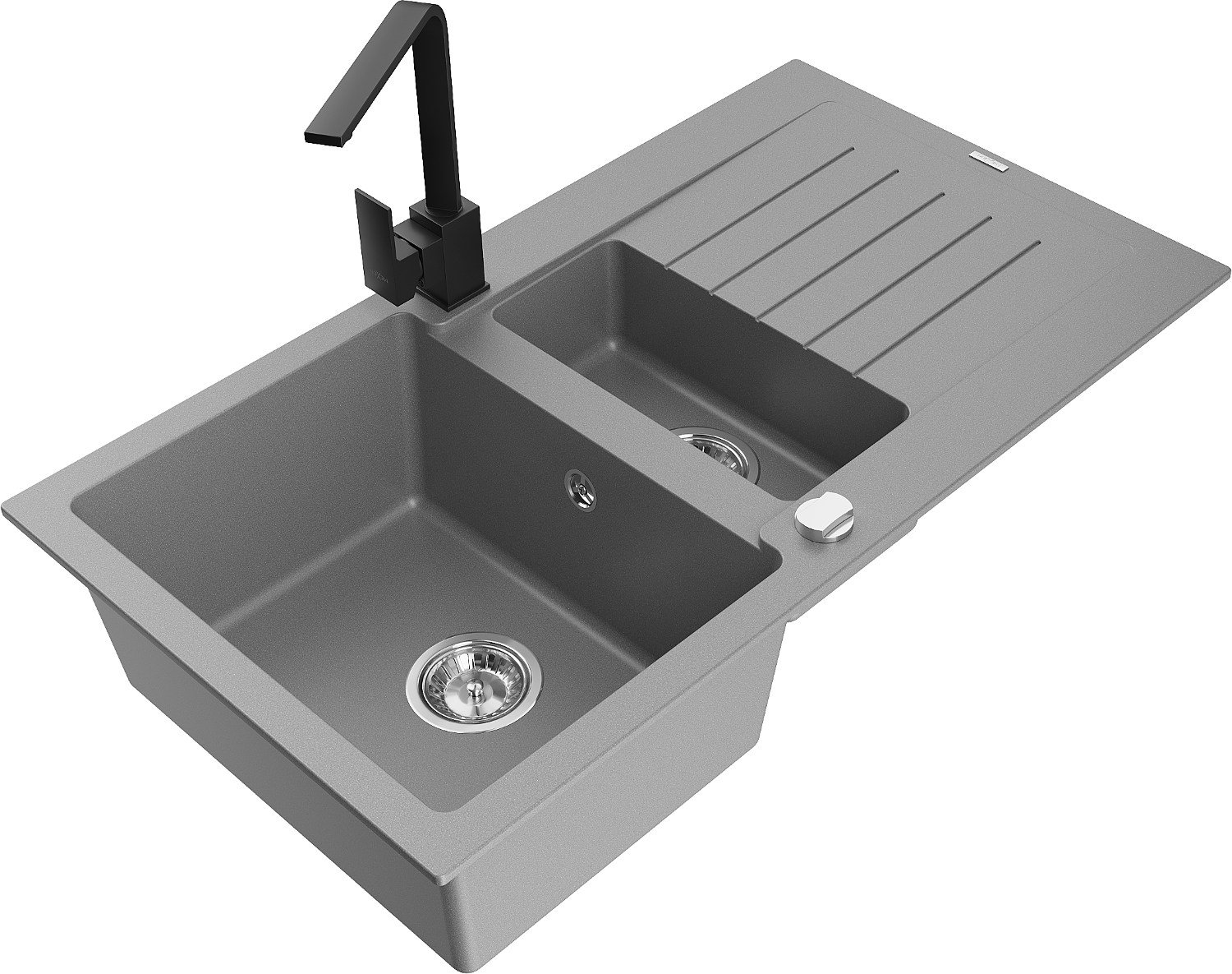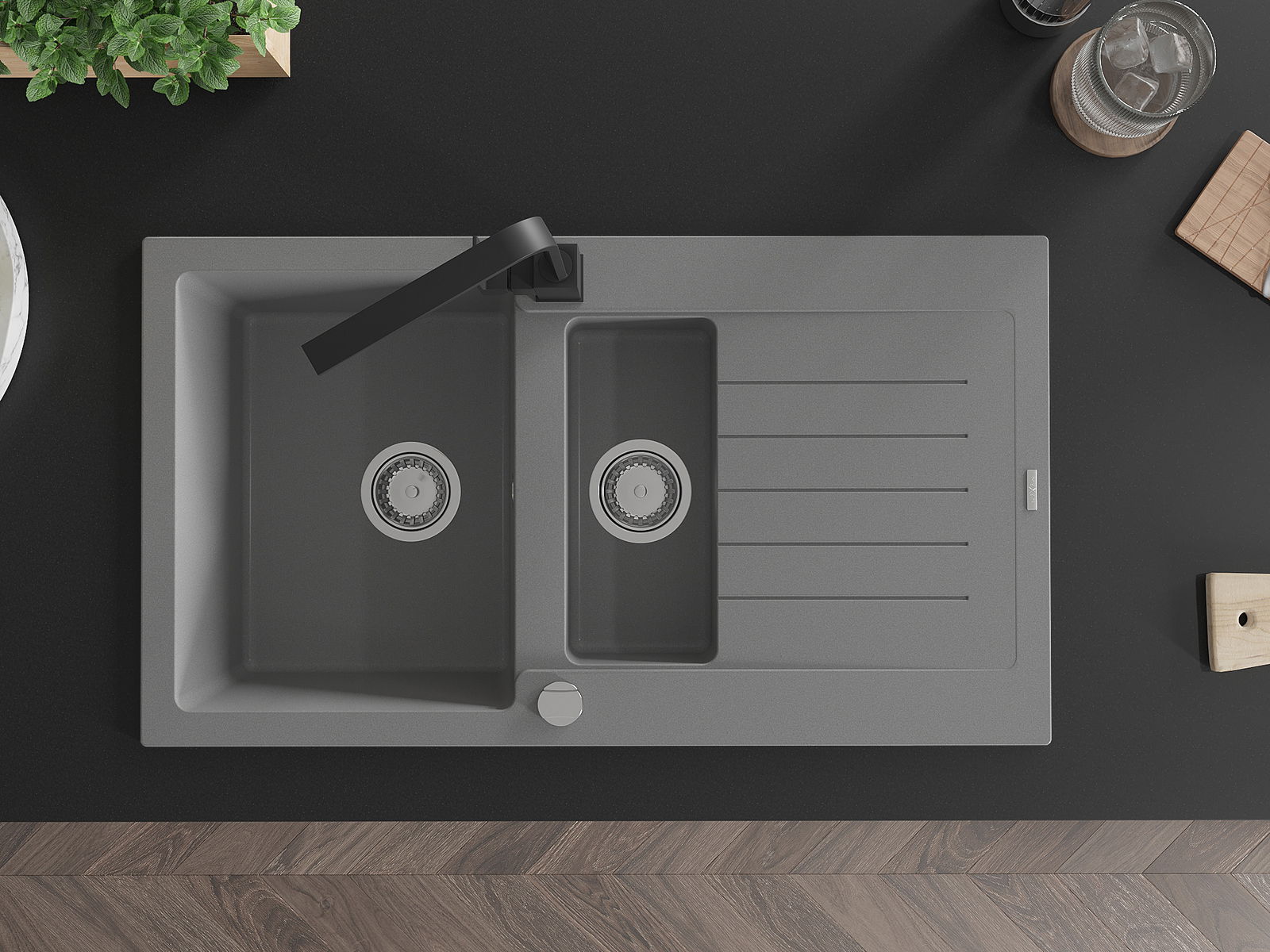 • Mexen Matias granitový dřez 1,5-komorový s odkapávačem a kuchyňskou baterií Rita, šedý - 6502-71-670300-70