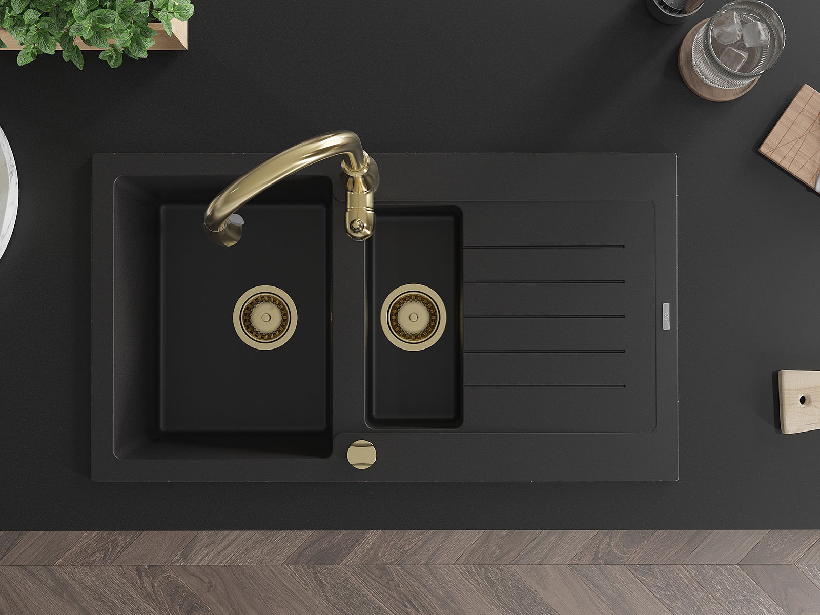 Mexen Matias granitový dřez 1,5-komorový s odkapávačem a kuchyňskou baterií Savita, černý - 6502-77-672601-50