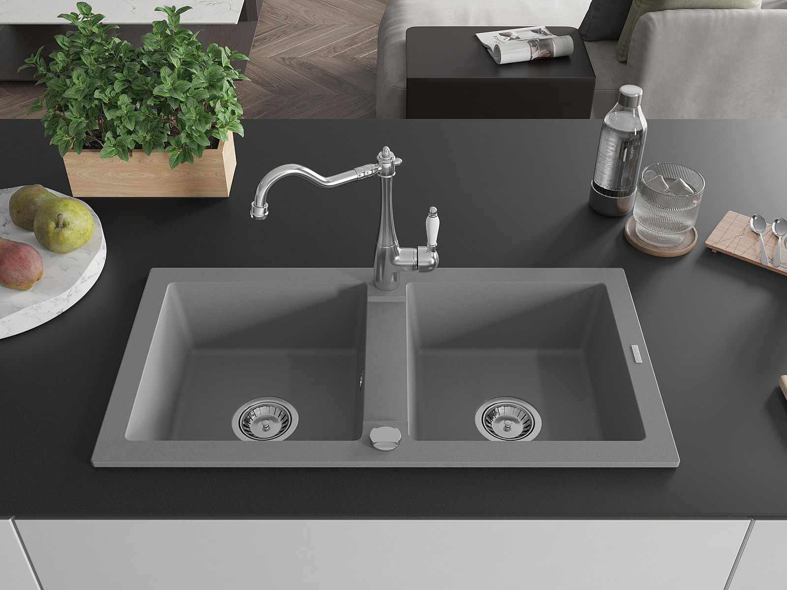 Mexen Mario žulový dvoukomorový dřez s kuchyňskou baterií Carla, šedý - 6504-71-670700-00