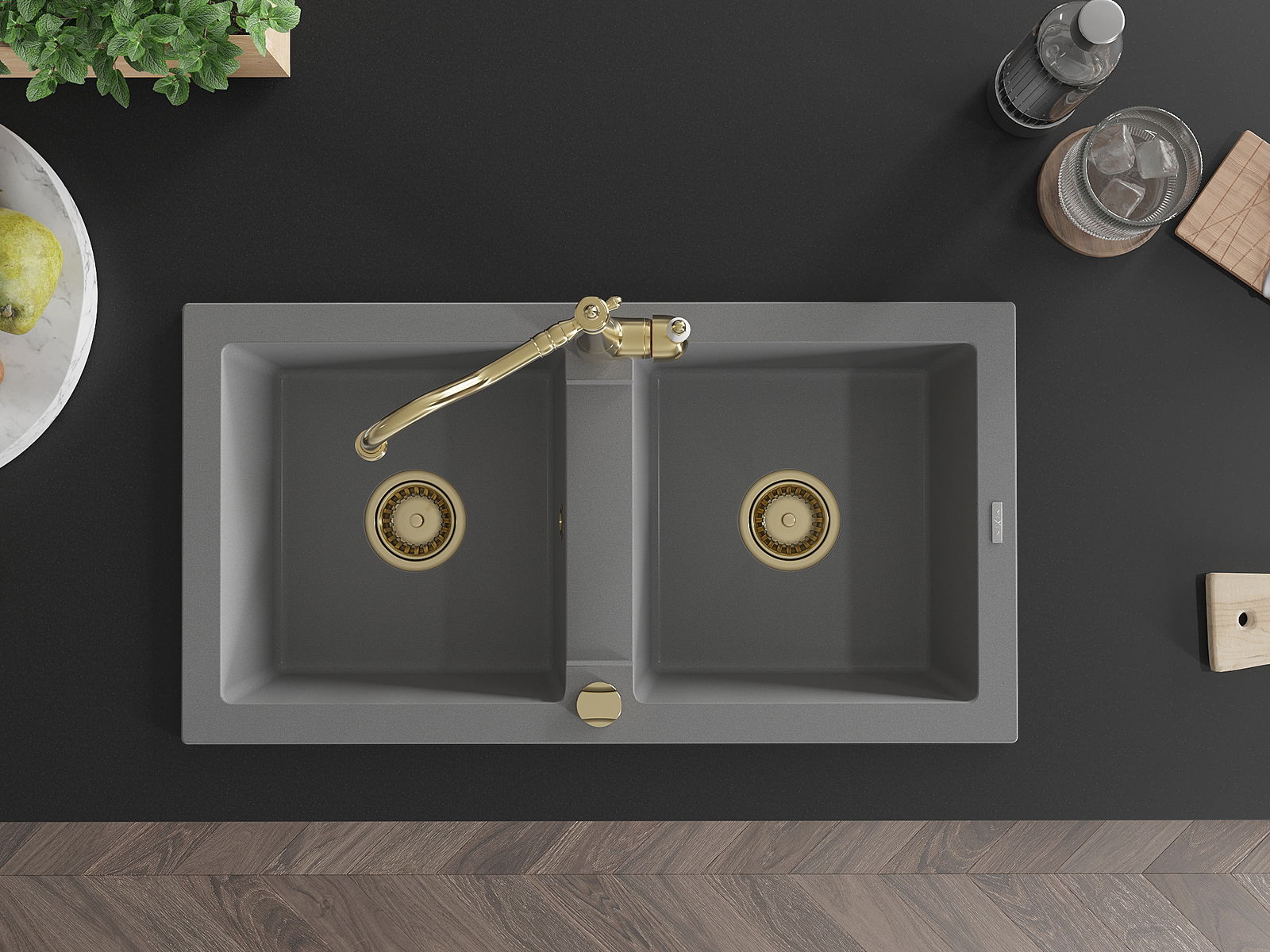 Mexen Mario žulový dřez 2-komorový s kuchyňskou baterií Carla, šedý - 6504-71-670700-50