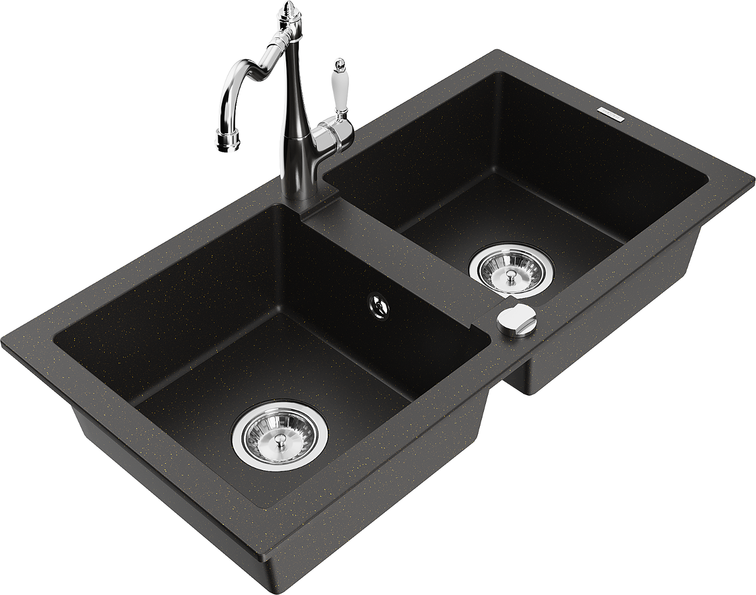 Mexen Mario dřez granitový 2-komorový s kuchyňskou baterií Carla, černý/zlatý metalik - 6504-75-670700-00