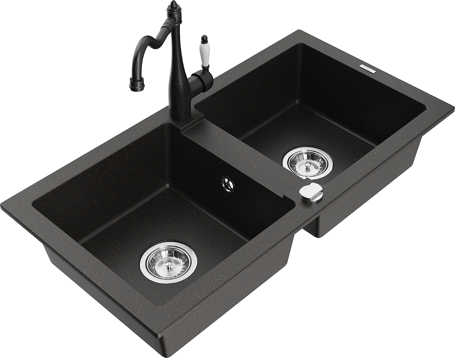 Mexen Mario granitový dřez dvoukomorový s kuchyňskou baterií Carla, černý/zlatý metalik - 6504-75-670700-70