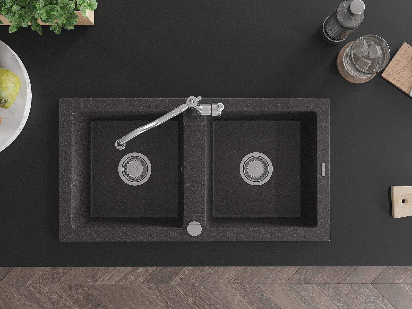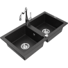 Mexen Mario dvoukomorový granitový kuchyňský dřez s kuchyňskou baterií Carla, černý kropenatý - 6504-76-670700-00