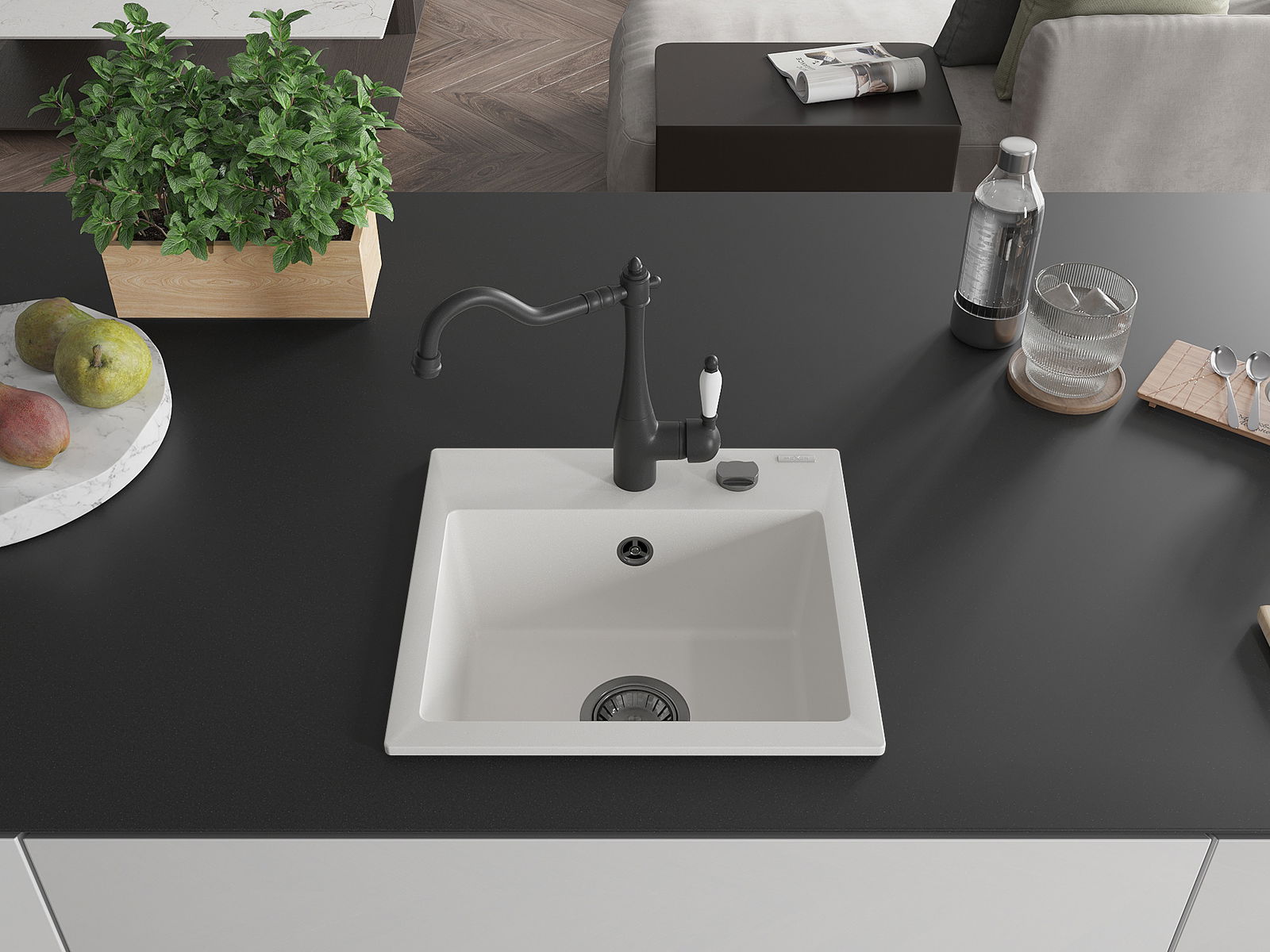 Mexen Milo granitový dřez 1-komorový s kuchyňskou baterií Carla, bílý - 6505-20-670700-70