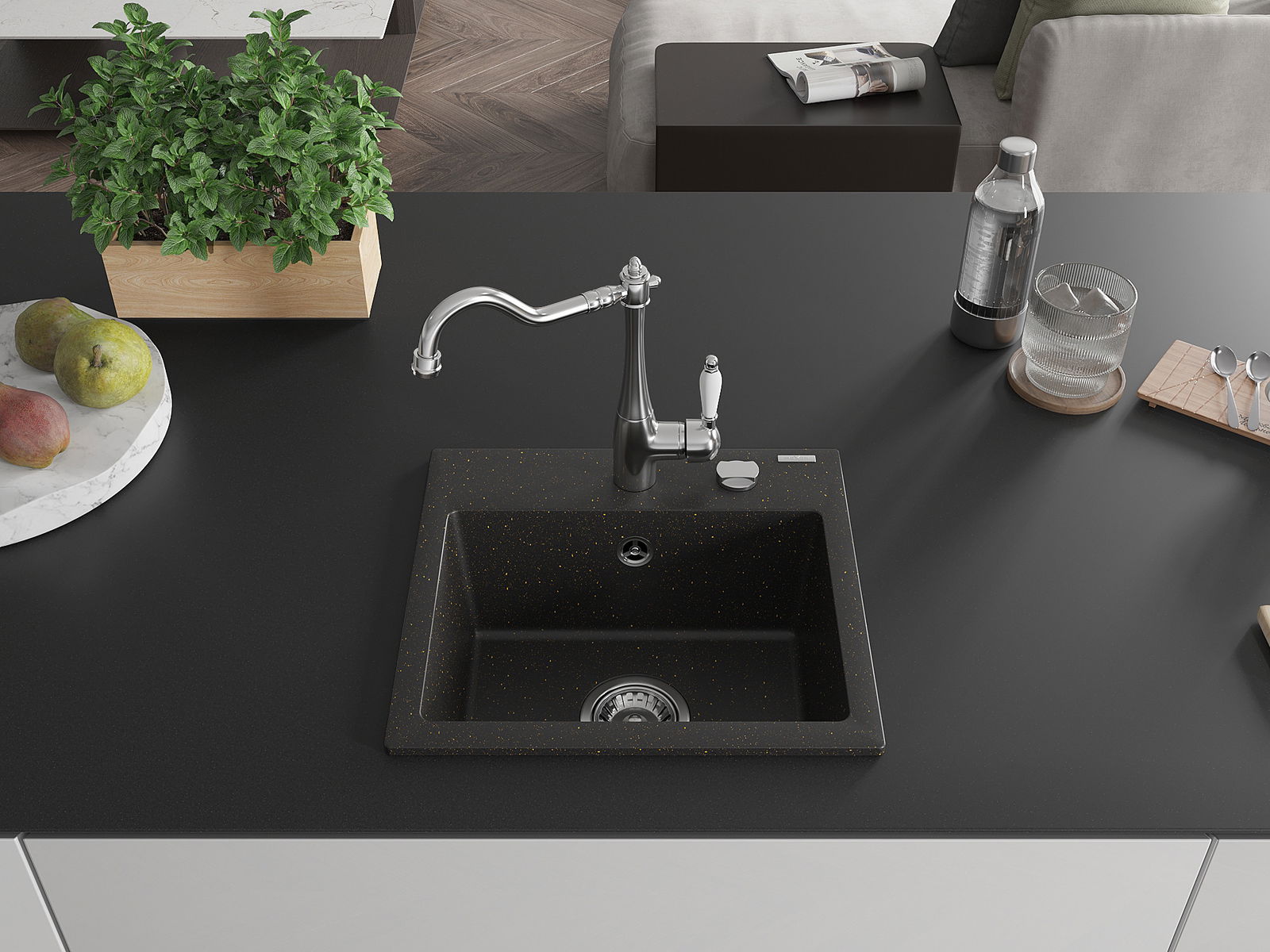 Mexen Milo granitový kuchyňský dřez 1-komorový s kuchyňskou baterií Carla, černý/zlatý metalik - 6505-75-670700-00
