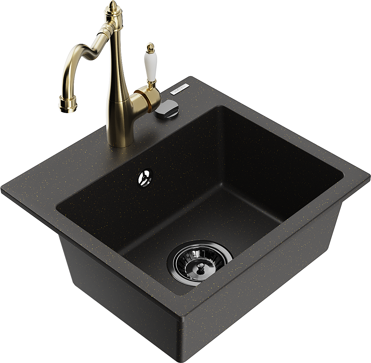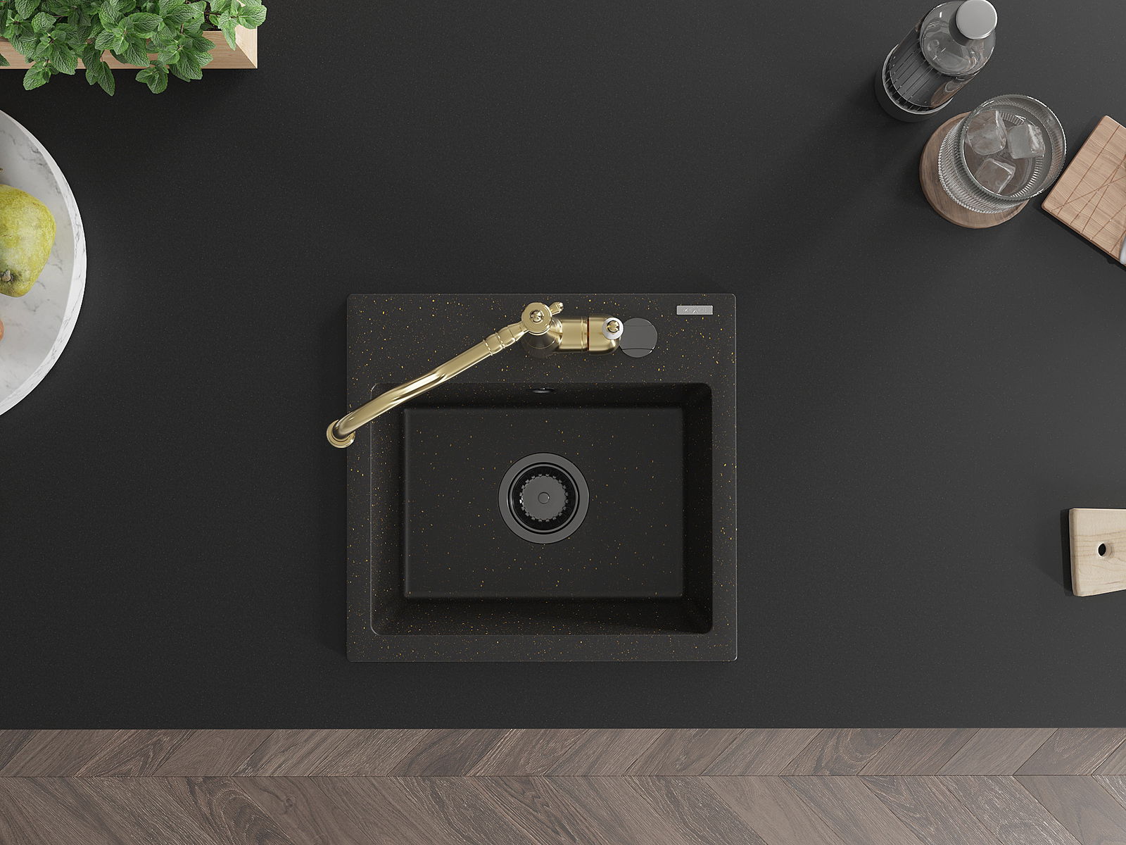 Mexen Milo žulový dřez 1-komorový s kuchyňskou baterií Carla, černý/zlatý metalik - 6505-75-670700-50-B