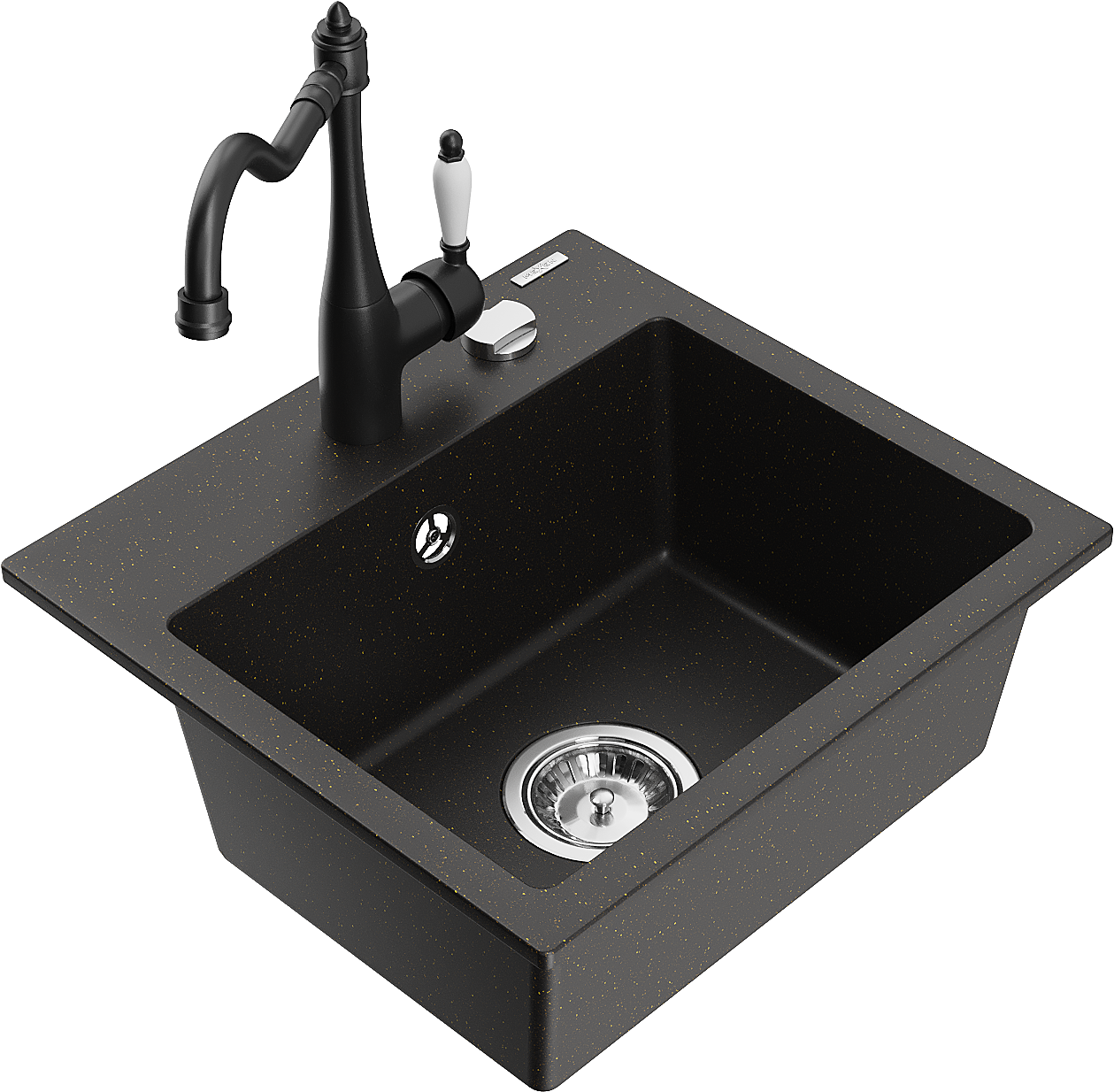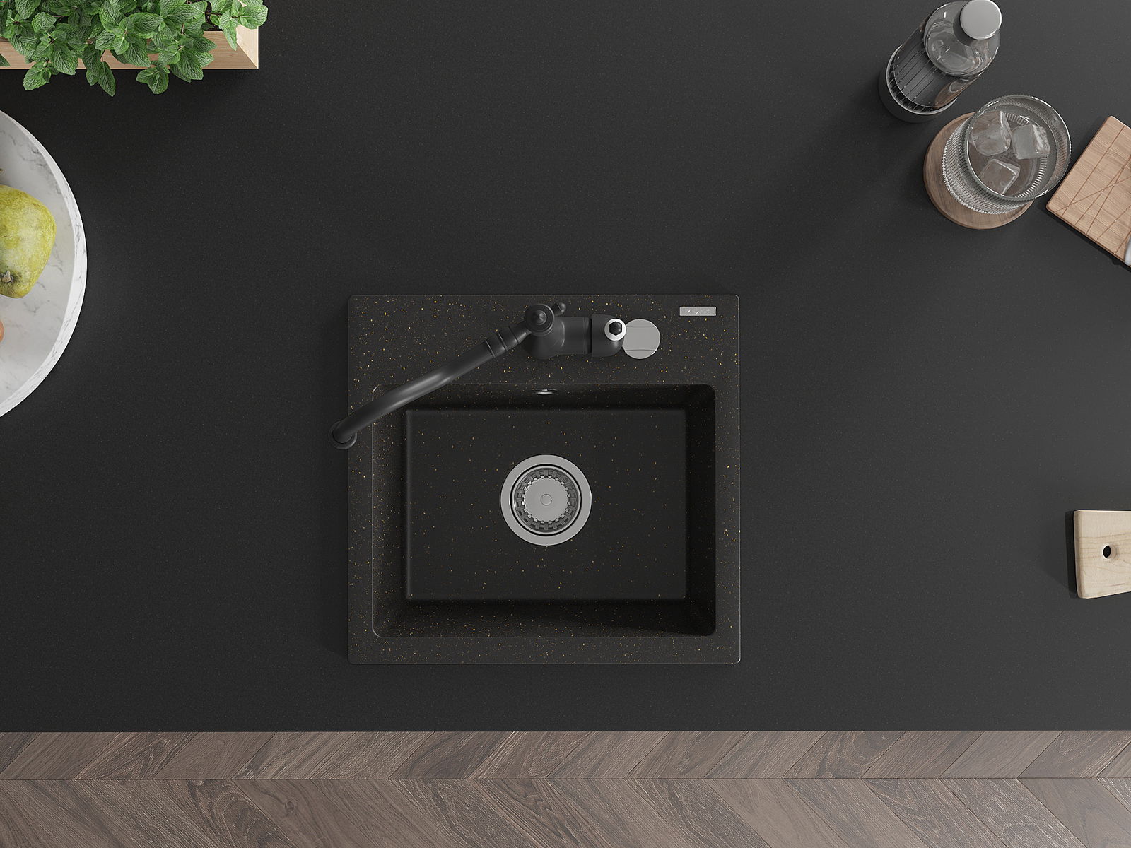 Mexen Milo granitový dřez 1-komorový s kuchyňskou baterií Carla, černý/zlatý metalík - 6505-75-670700-70