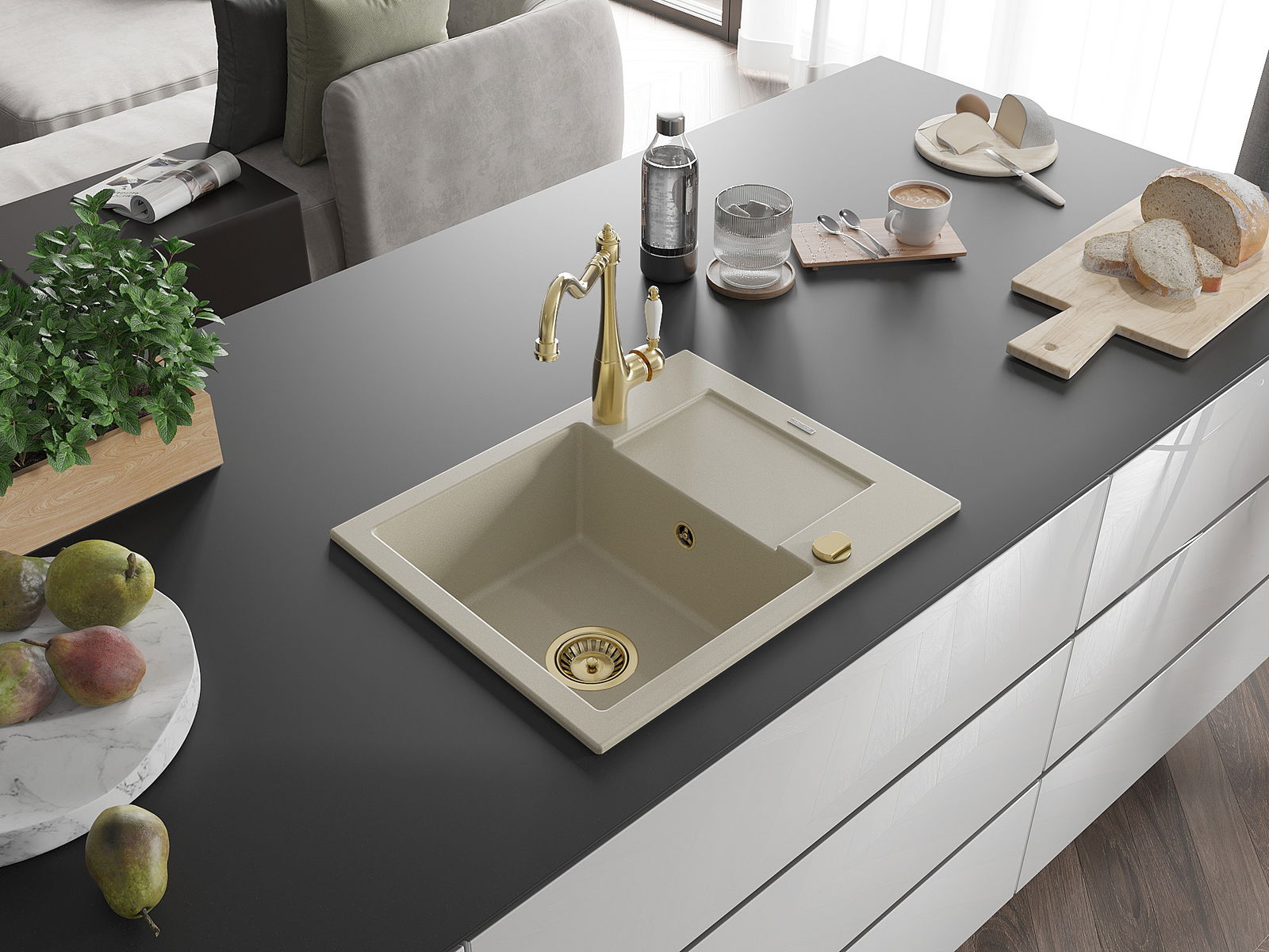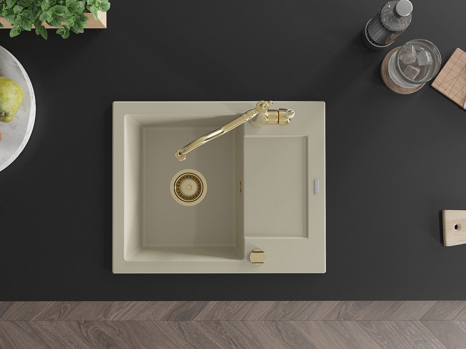 Mexen Enzo granitový dřez 1-komorový s odkapávačem a kuchyňskou baterií Carla, béžový - 6506-69-670700-50