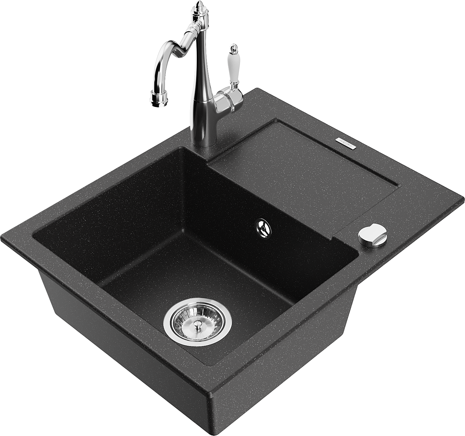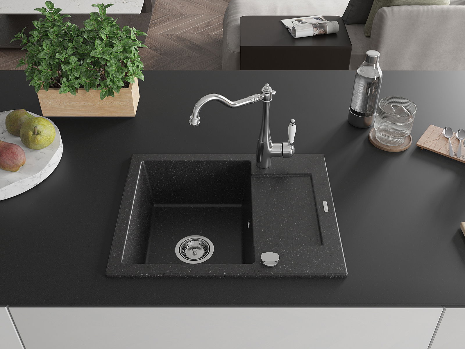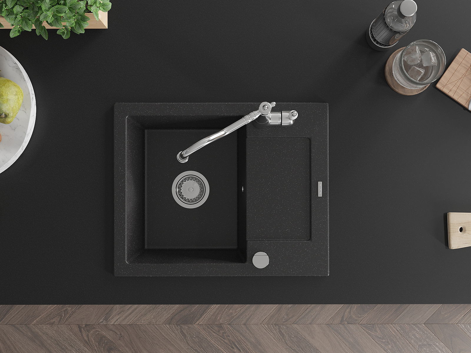 Mexen Enzo granitový dřez s 1 komorou, s odkapávačem a kuchyňskou baterií Carla, černý/stříbrný metalik - 6506-73-670700-00