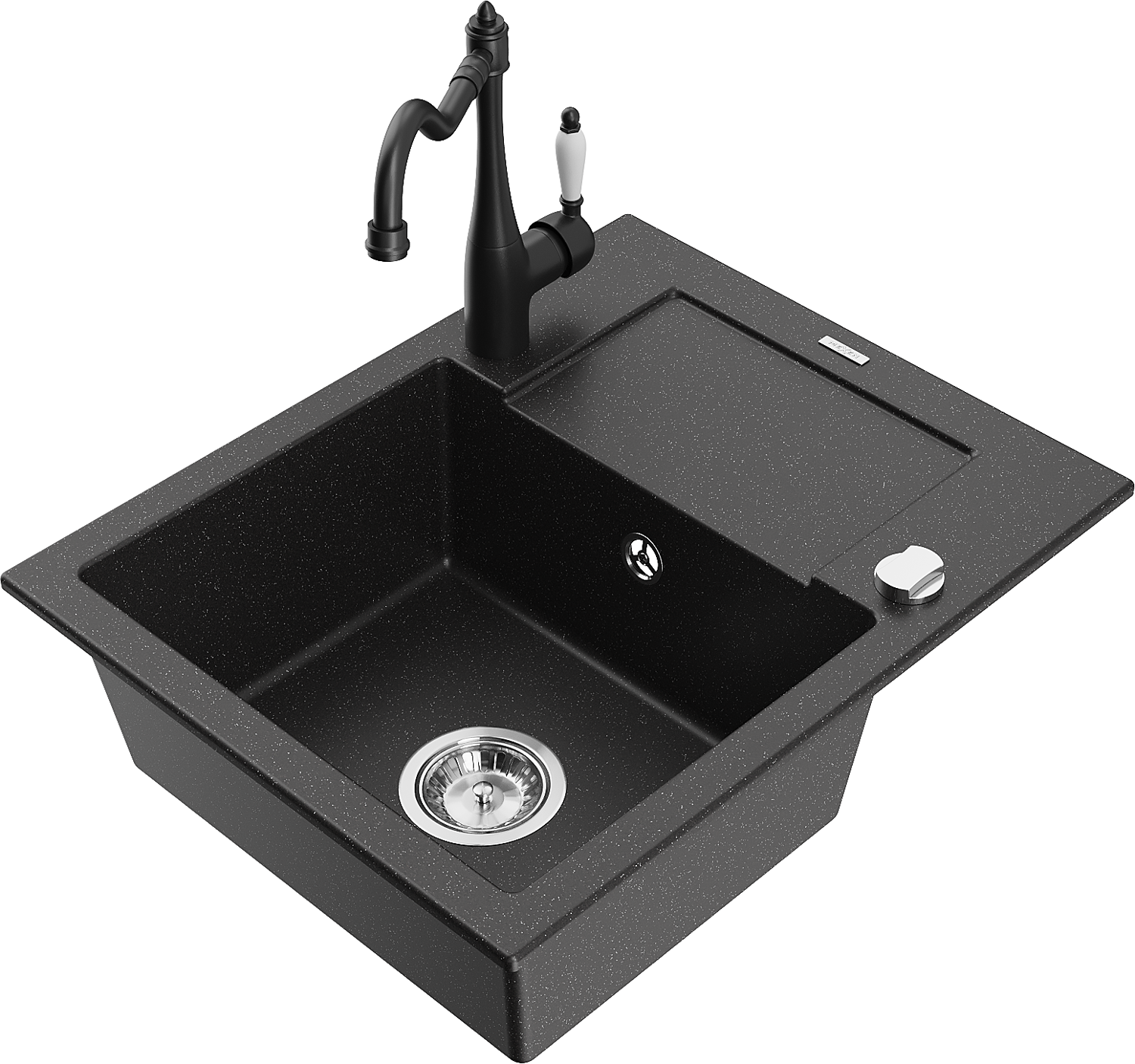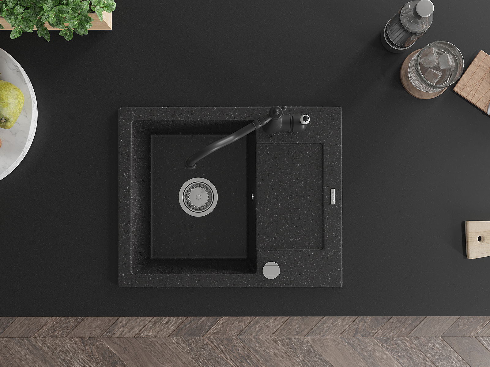 Mexen Enzo granitový dřez 1-komorový s odkapávačem a kuchyňskou baterií Carla, černý/stříbrný metalík - 6506-73-670700-70