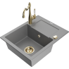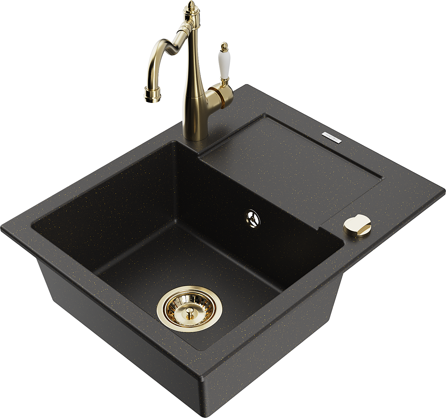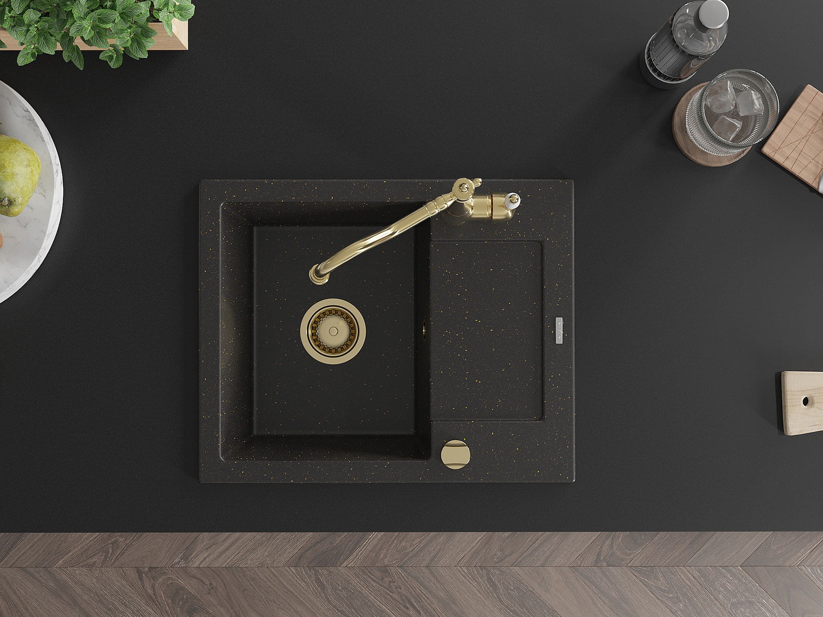 Mexen Enzo granitový dřez 1-komorový s odkapávačem a kuchyňskou baterií Carla, černý/zlatý metalický - 6506-75-670700-50
