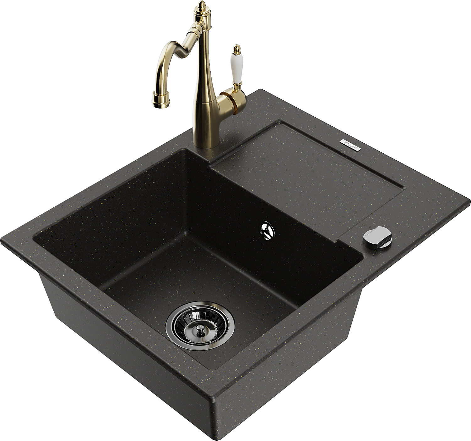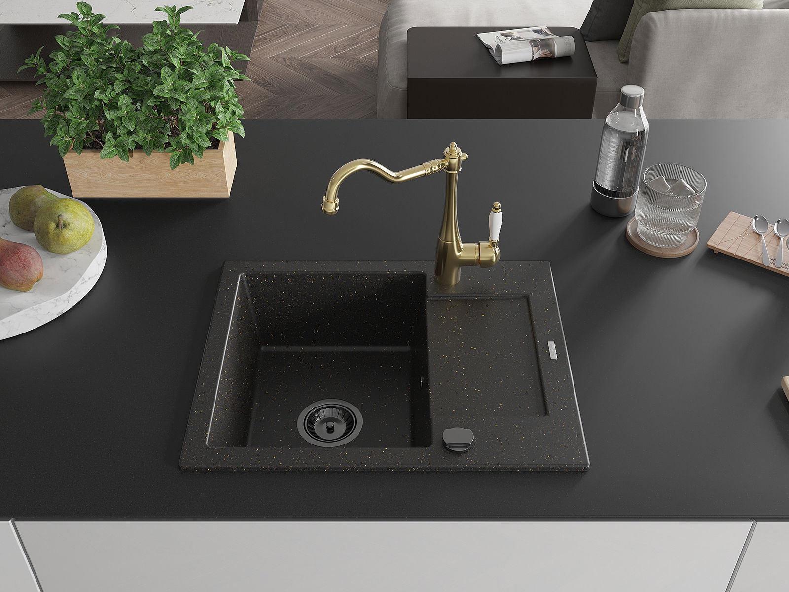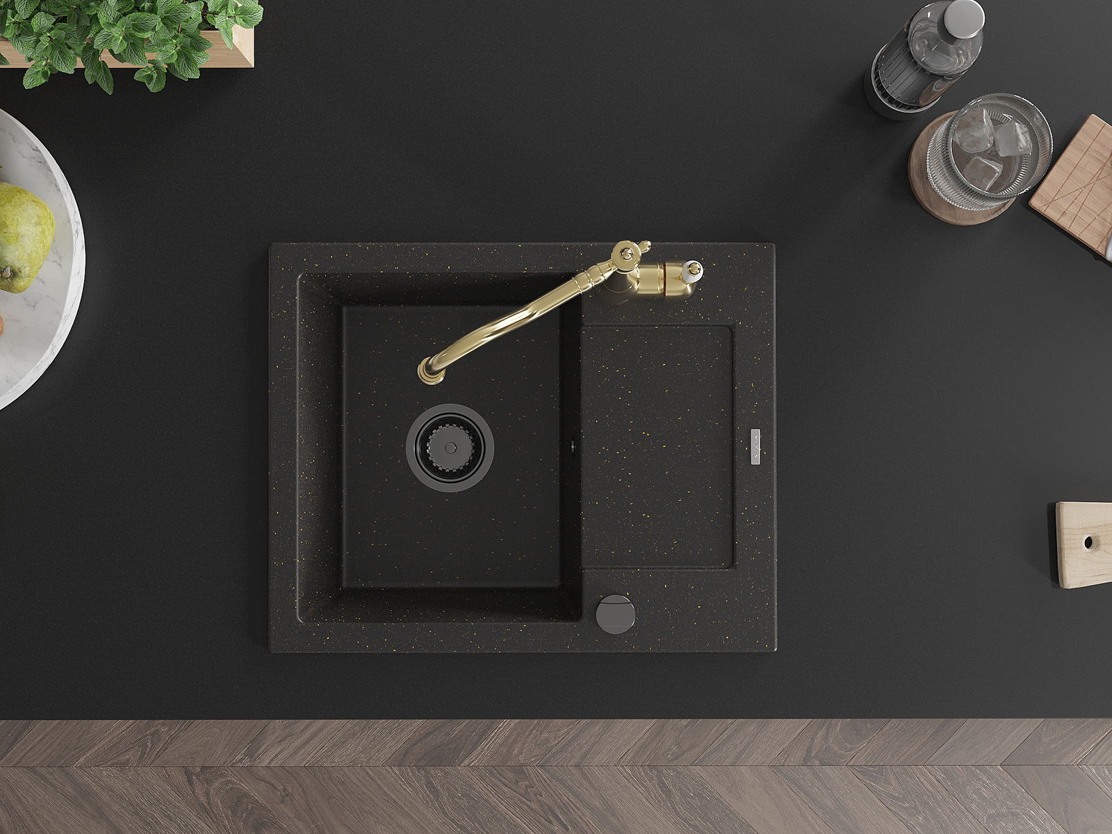 Mexen Enzo granitový dřez s jednou komorou, odkapávačem a kuchyňskou baterií Carla, černý/zlatý metalik - 6506-75-670700-50-B