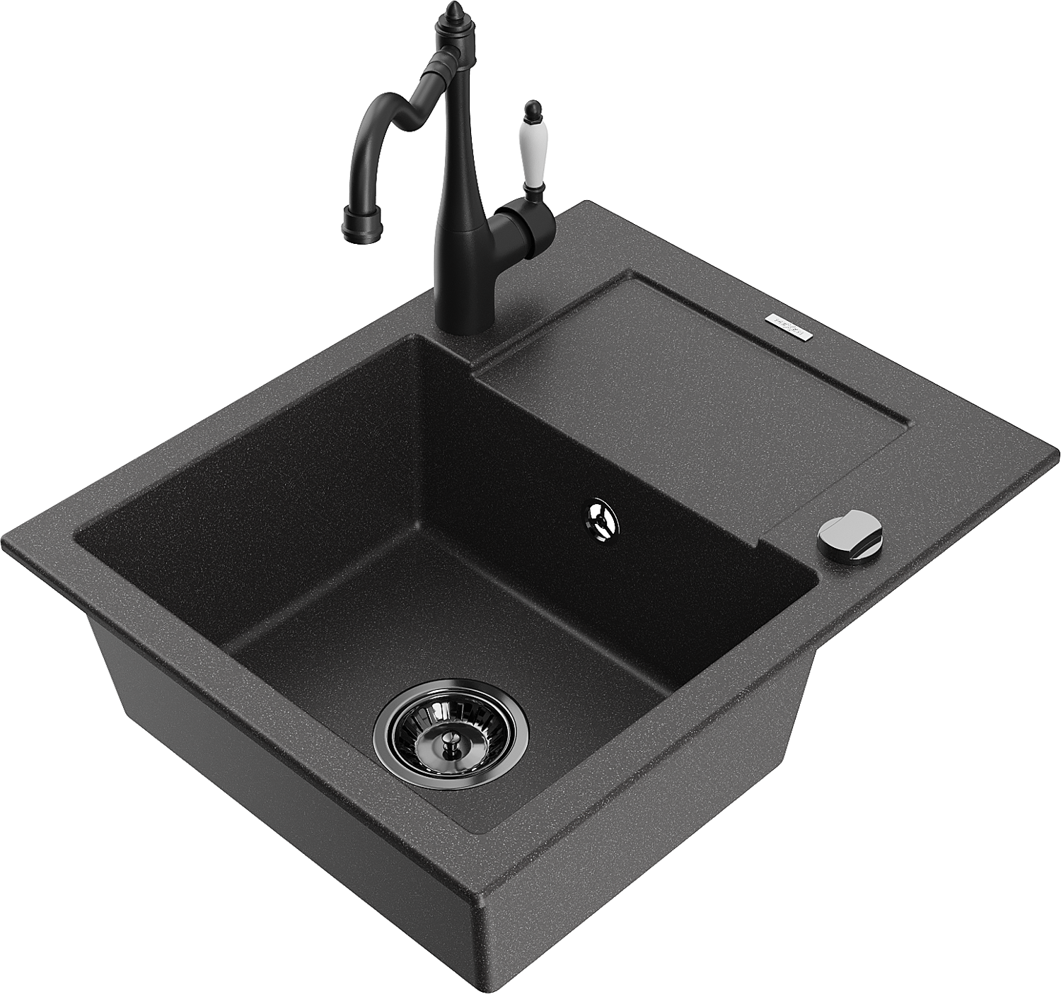 Mexen Enzo granitový dřez 1-komorový s odkapem a kuchyňskou baterií Carla, černý skvrnitý - 6506-76-670700-70-B
