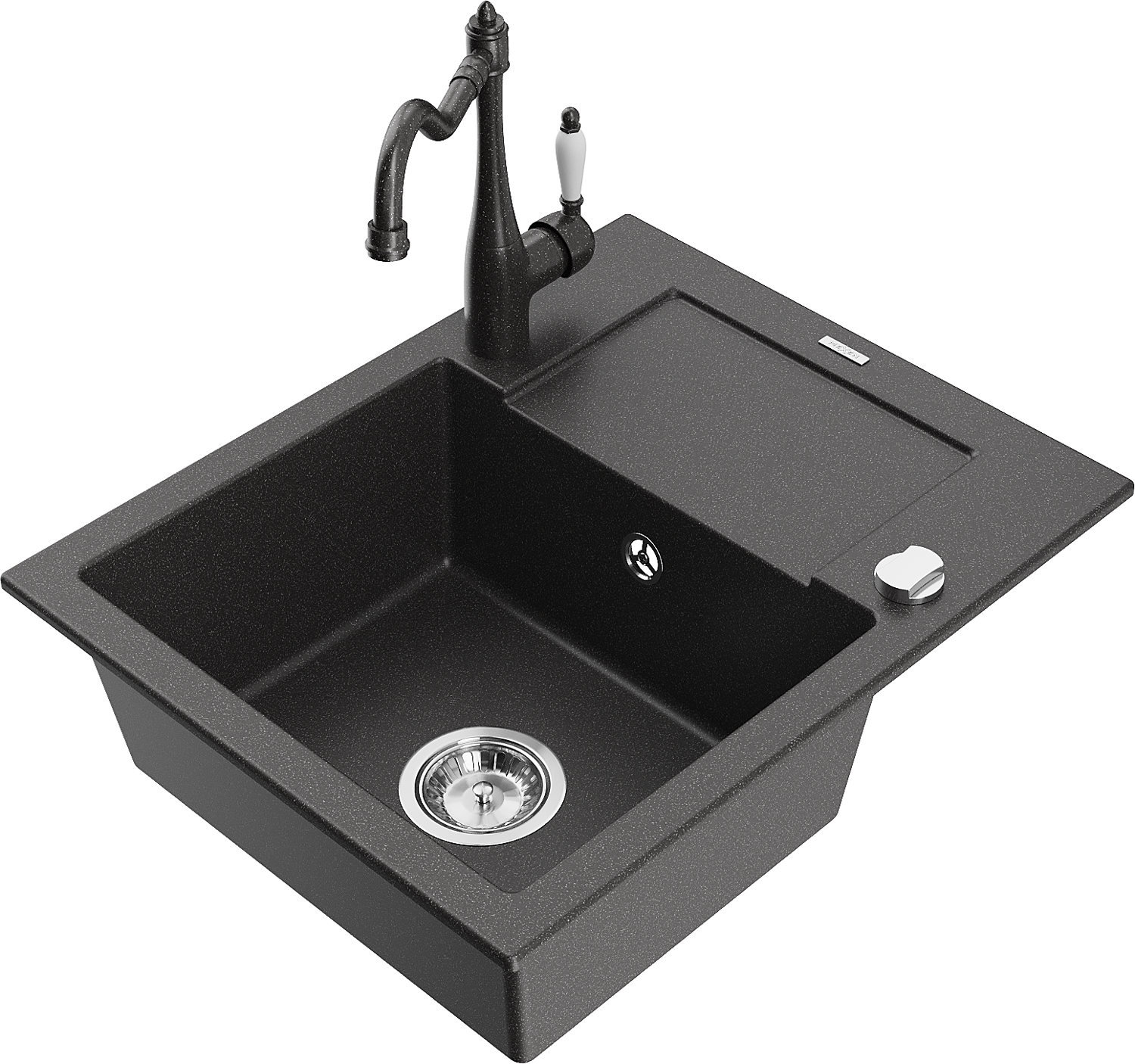 Mexen Enzo granitový dřez 1-komorový s odkapávačem a kuchyňskou baterií Carla, černý skvrnitý - 6506-76-670700-76
