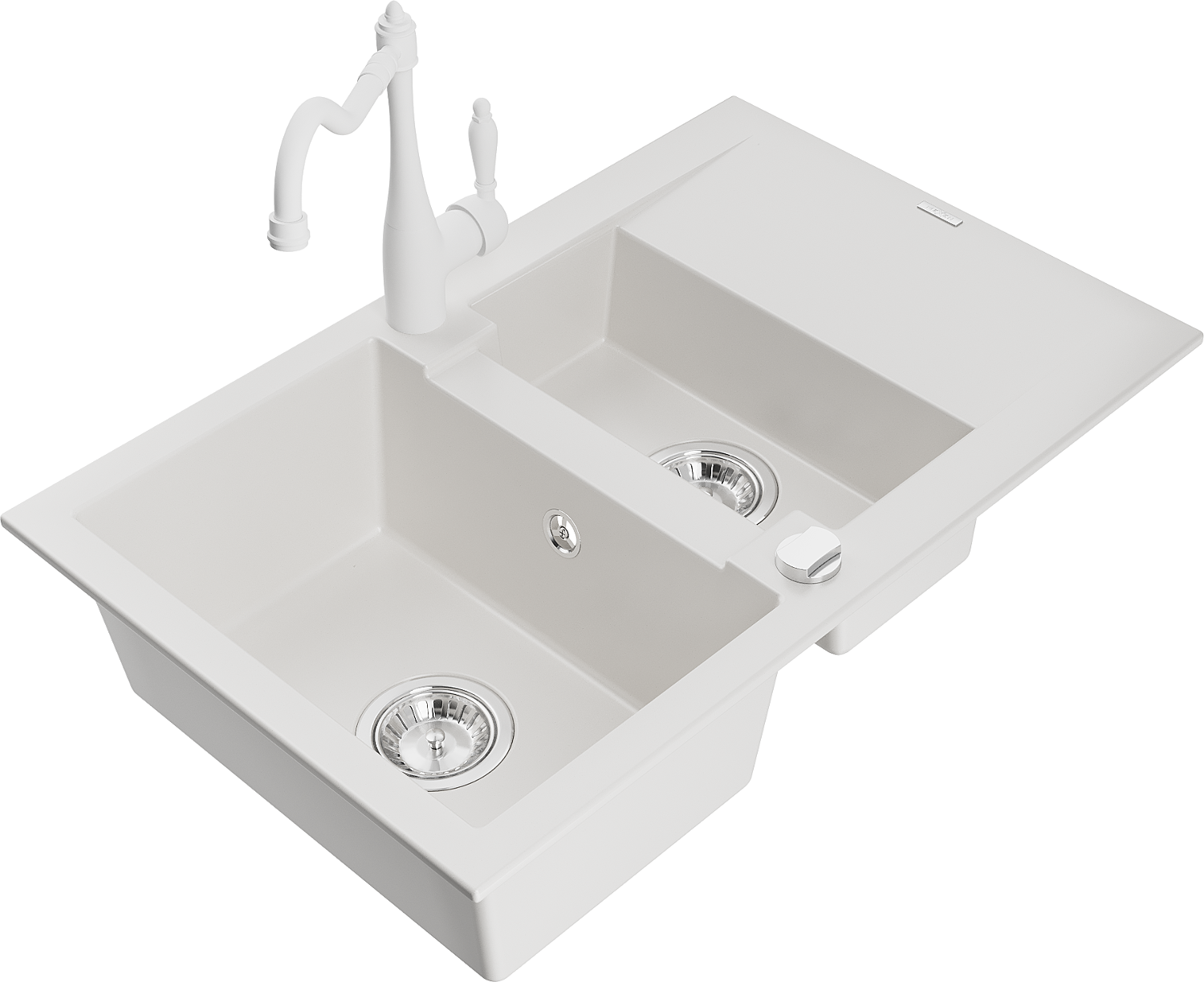 Mexen Gaspar dřez granitový 1,5-komorový s odkapávačem a kuchyňskou baterií Carla, bílý - 6507-20-670700-20