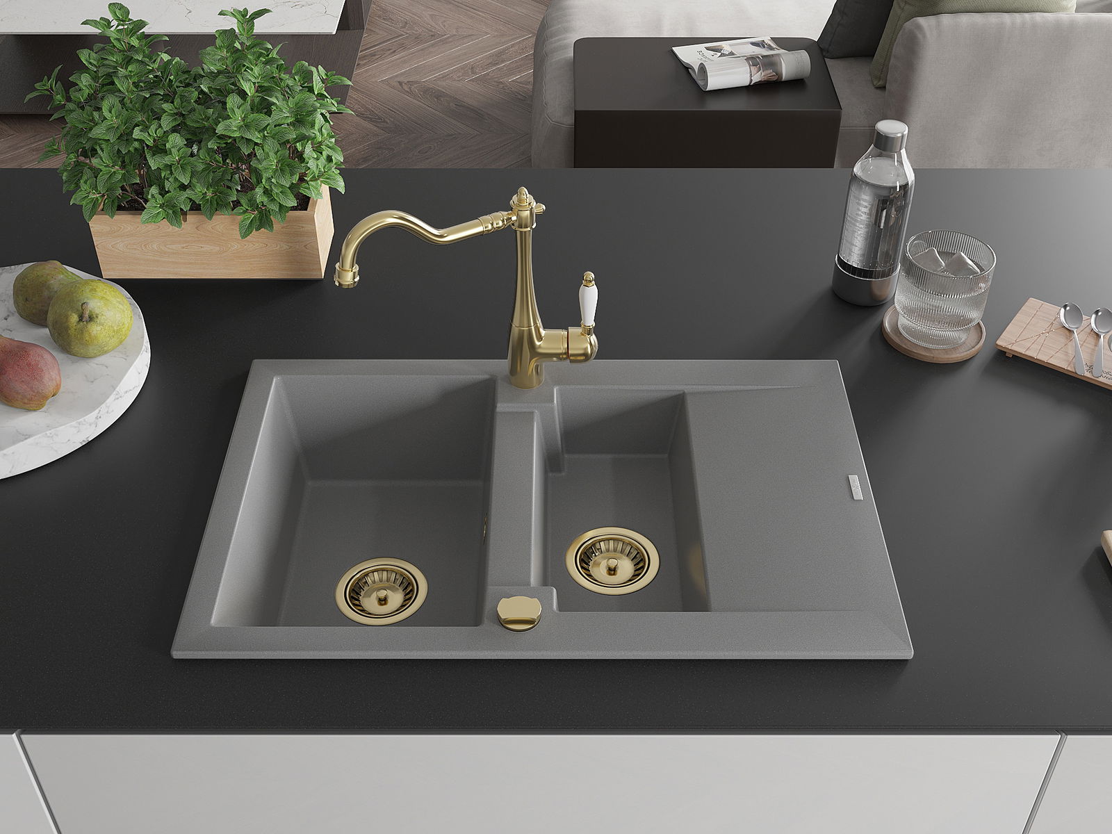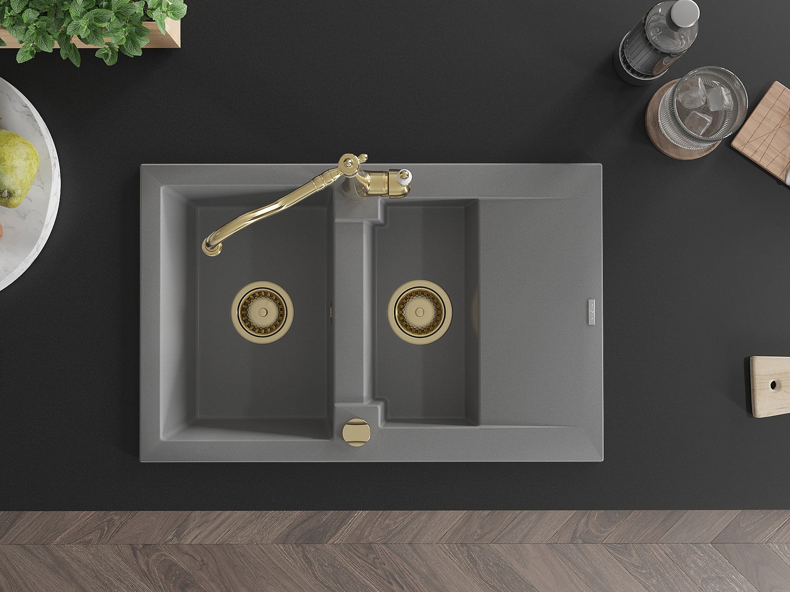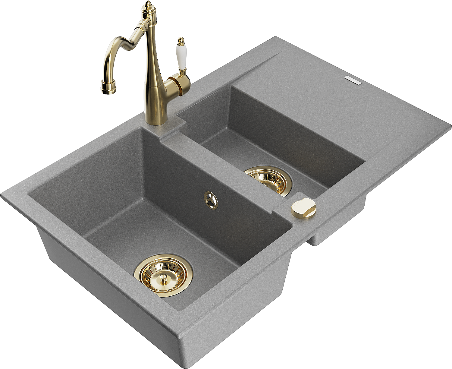 Mexen Gaspar žulový kuchyňský dřez 1,5-komorový s odkapávačem a kuchyňskou baterií Carla, šedý - 6507-71-670700-50