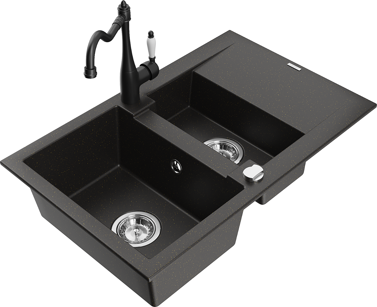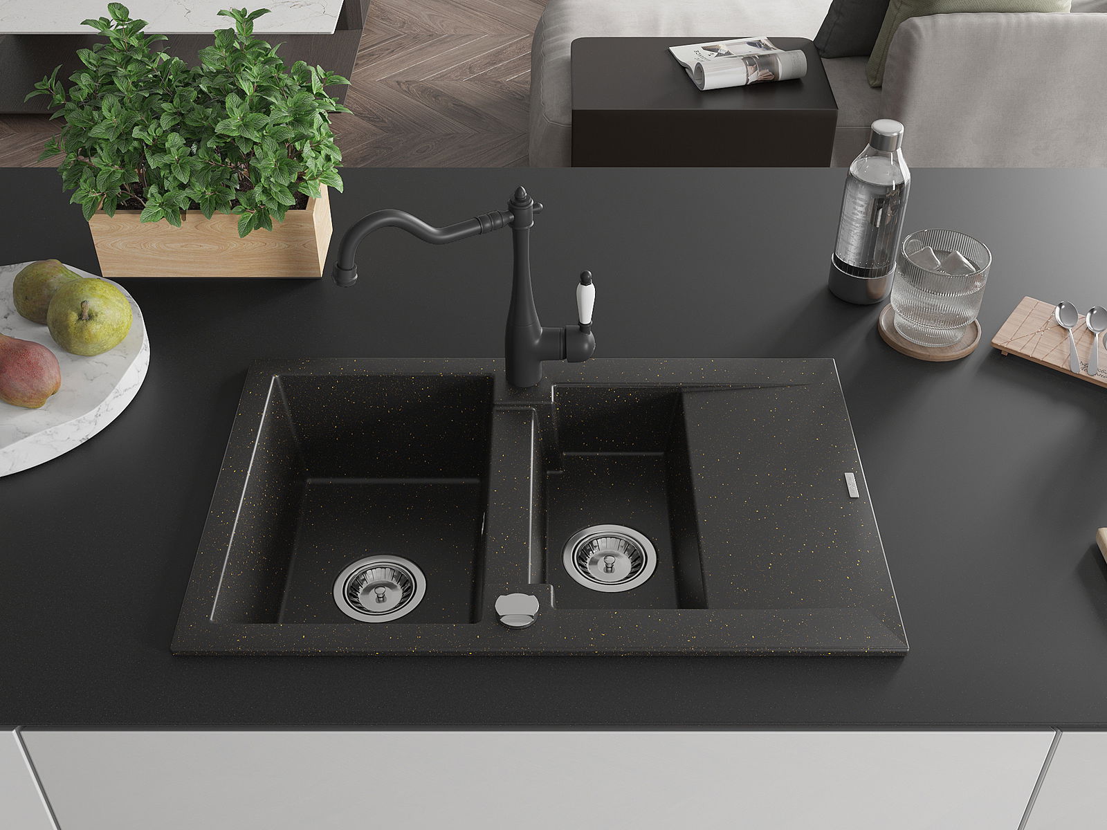 Mexen Gaspar granitový dřez 1,5-komorový s odkapávačem a kuchyňskou baterií Carla, černý/zlatý metalik - 6507-75-670700-70