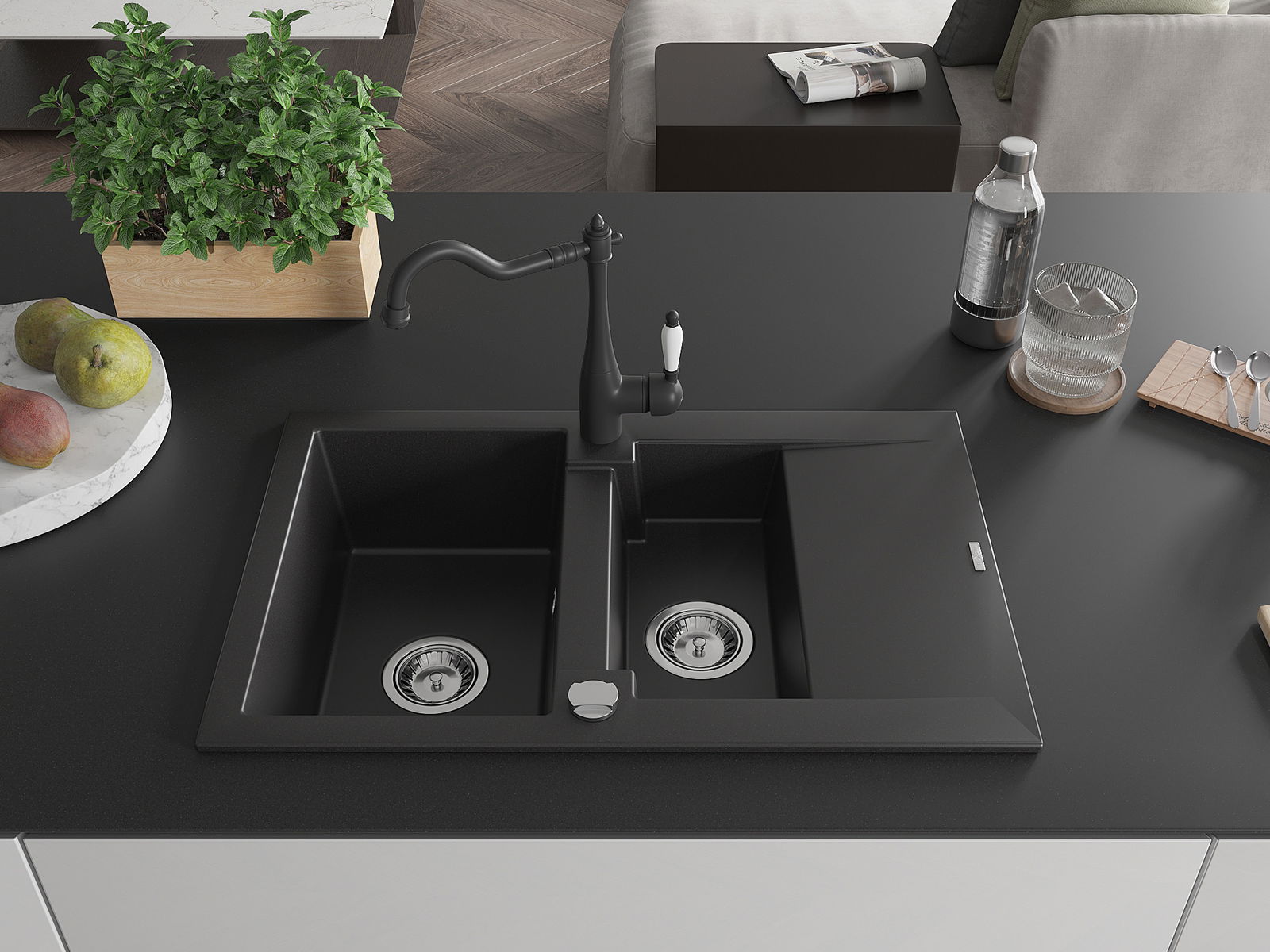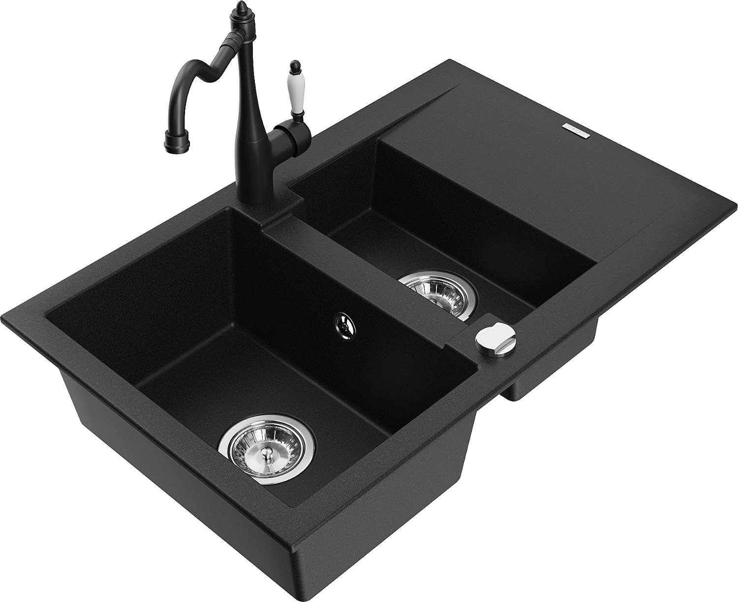 Mexen Gaspar granitový dřez 1,5-komorový s odkapávačem a kuchyňskou baterií Carla, černý - 6507-77-670700-70