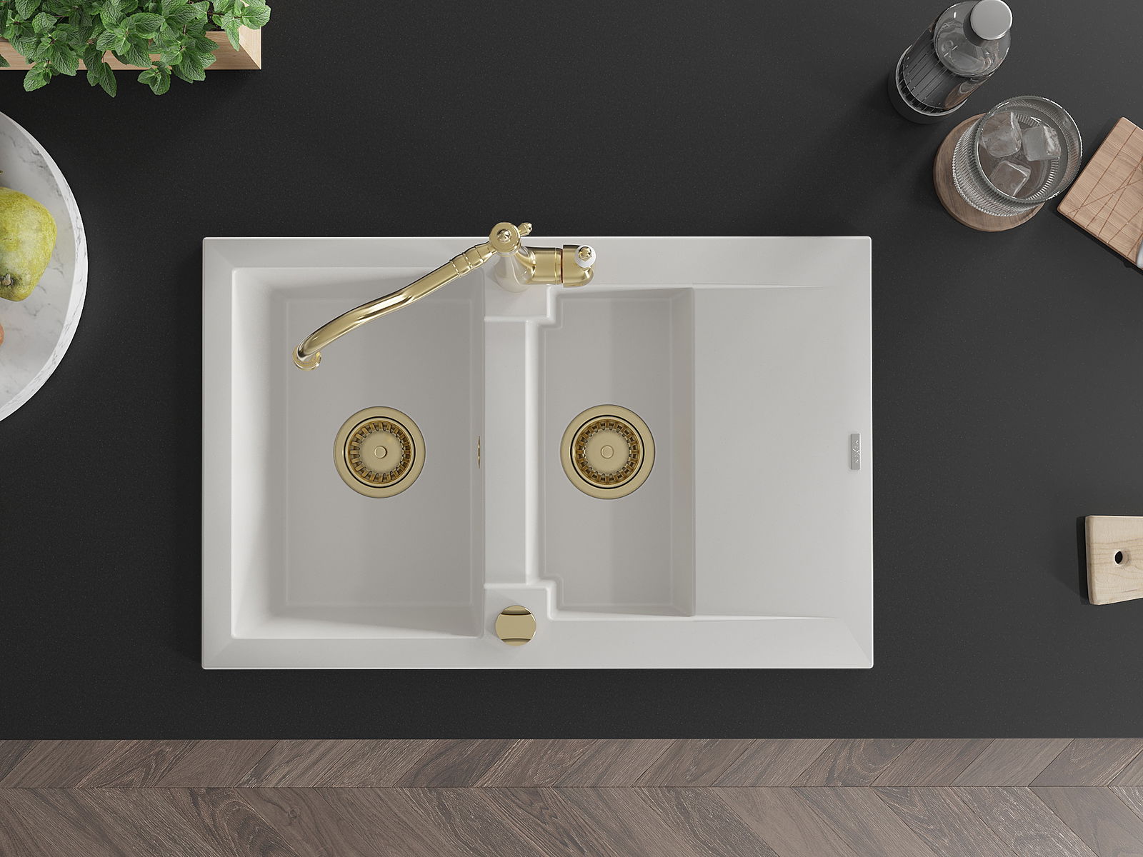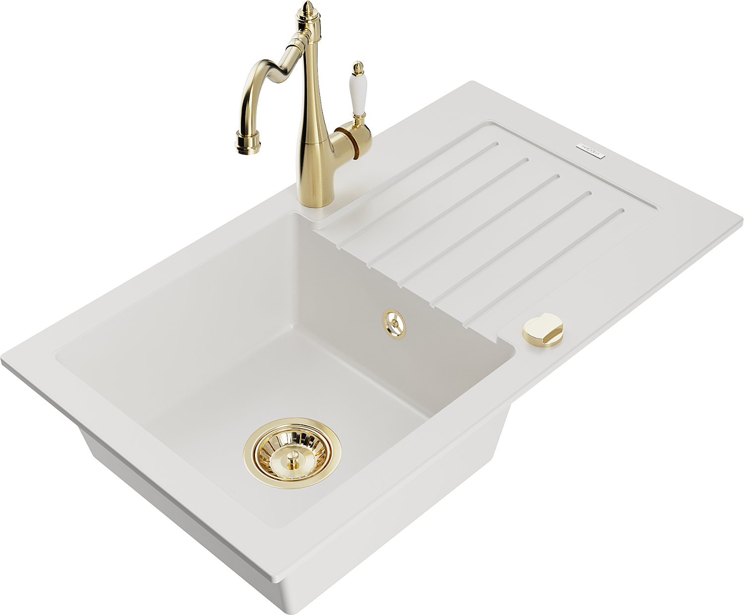 Mexen Pablo jednokomorový žulový dřez s odkapávačem a kuchyňská baterie Carla, bílá - 6510-20-670700-50