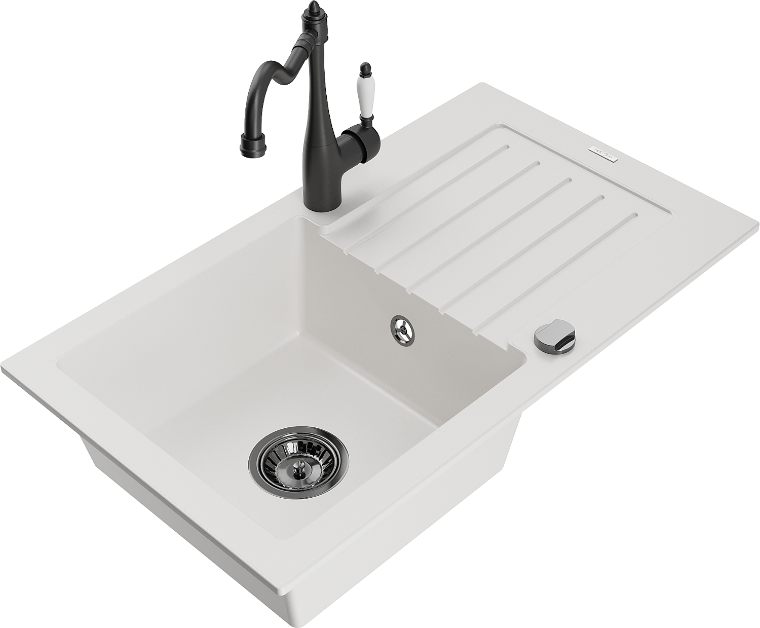 Mexen Pablo granitový dřez jednodřezový s odkapávačem a kuchyňskou baterií Carla, bílý - 6510-20-670700-70