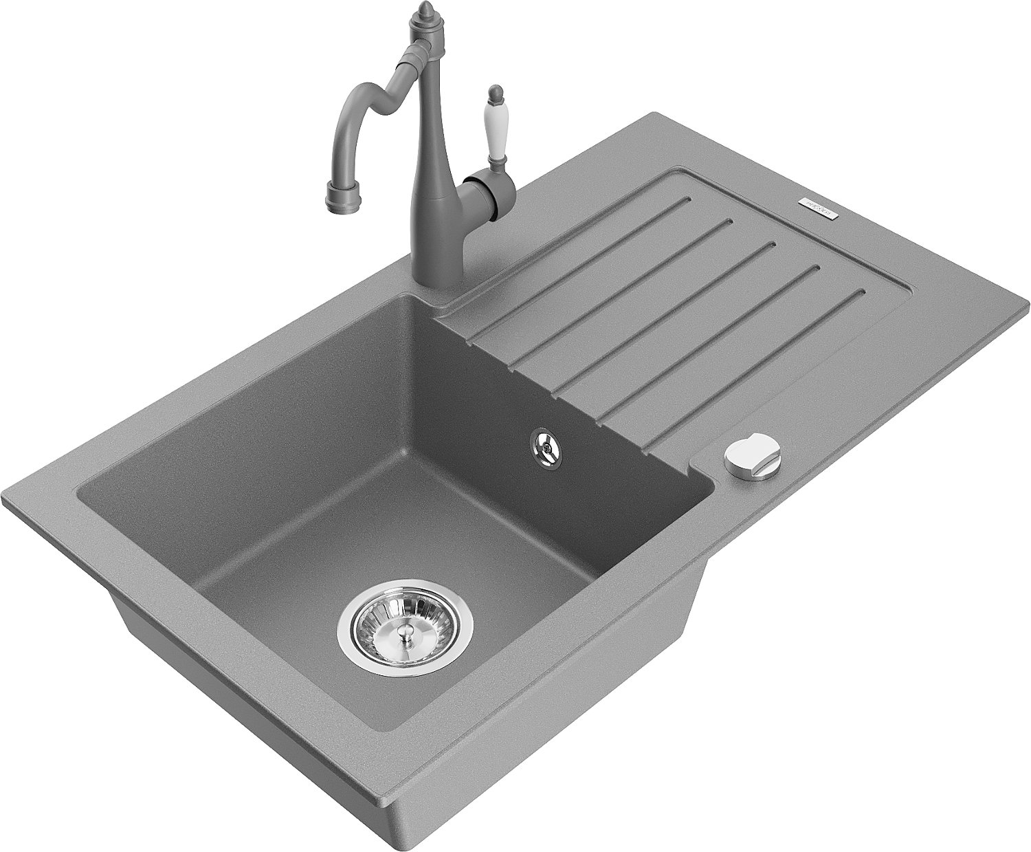 Mexen Pablo granitový dřez 1-komorový s odkapávačem a kuchyňskou baterií Carla, šedý - 6510-71-670700-71