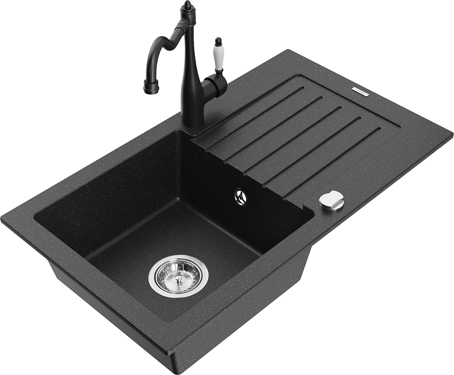 Mexen Pablo žulový dřez 1-komorový s odkapávačem a kuchyňskou baterií Carla, černý/stříbrný metalík - 6510-73-670700-70