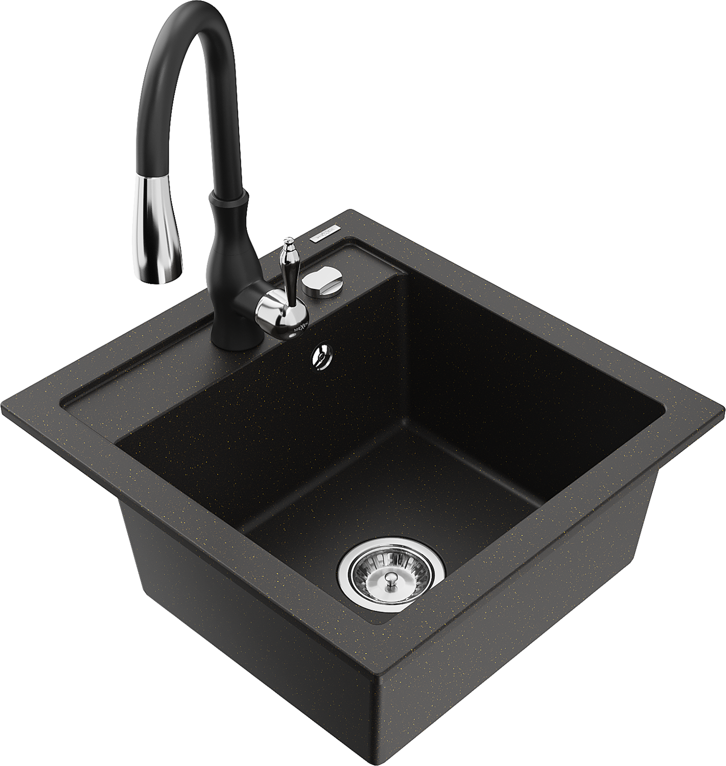 Mexen Vito granitový dřez 1-komorový s kuchyňskou baterií Savita, černý/zlatý metalický - 6503-75-672601-70