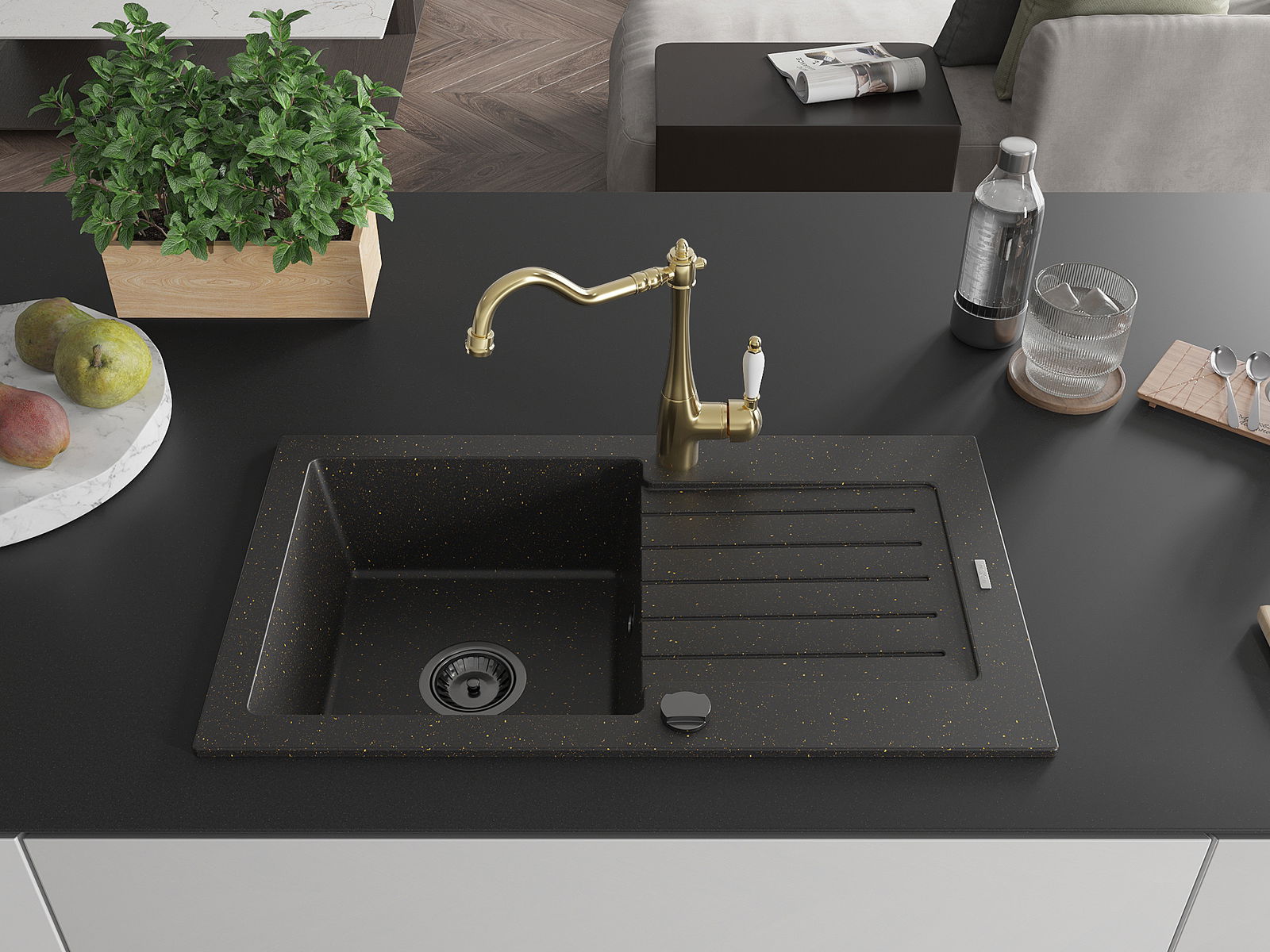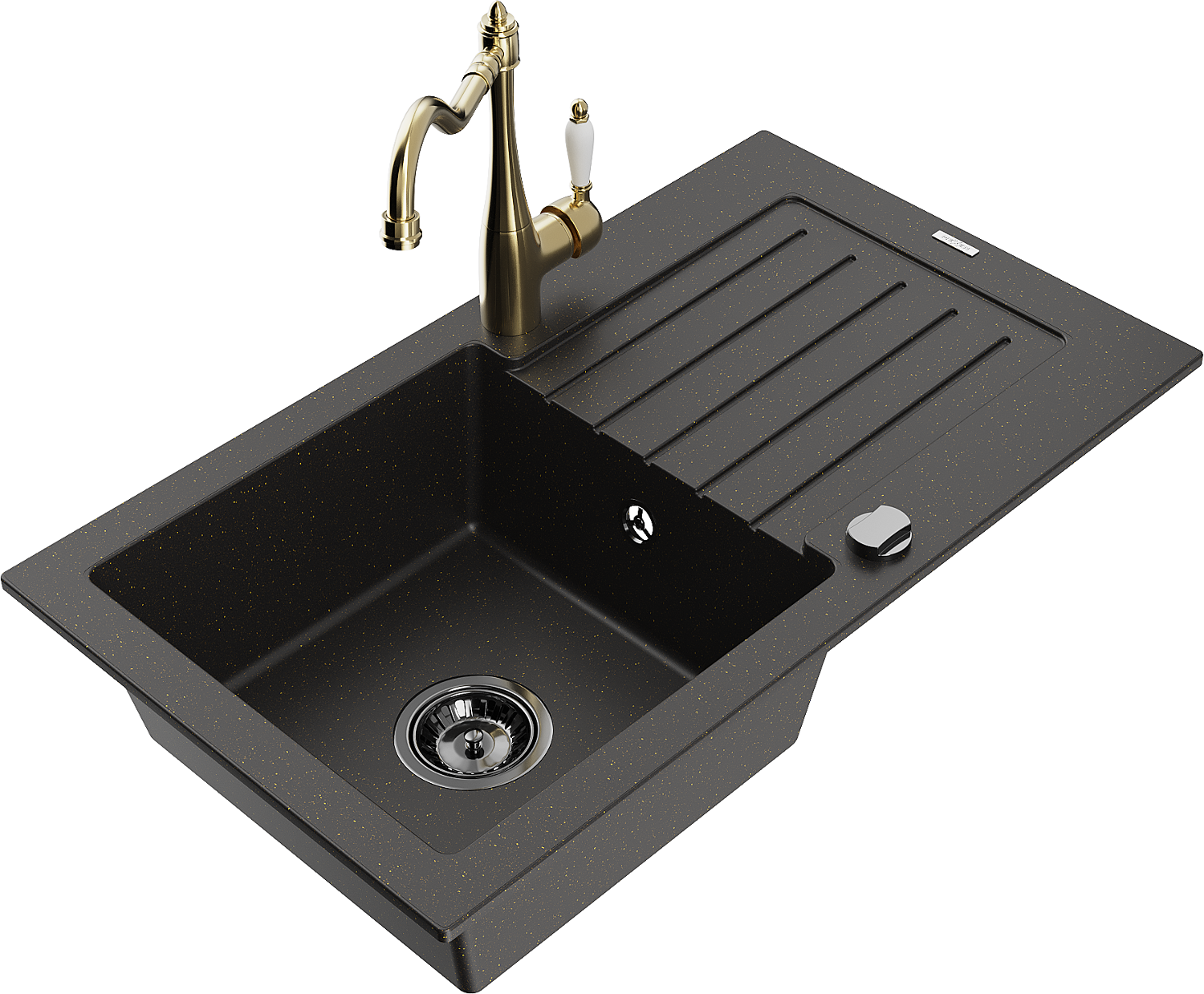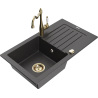 Mexen Pablo žulový dřez s 1 komorou a odkapávačem a kuchyňská baterie Carla, černá/zlatý metalík - 6510-75-670700-50-B