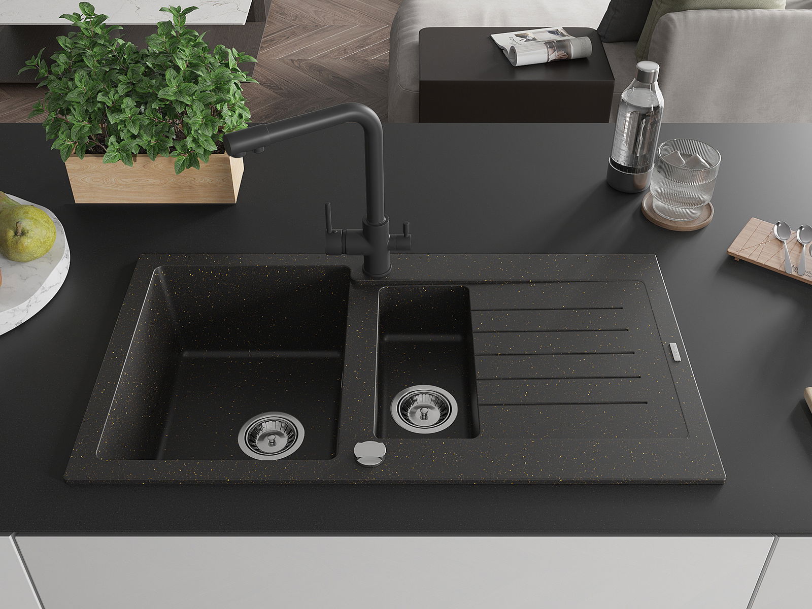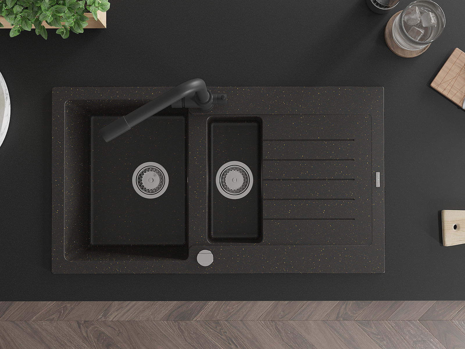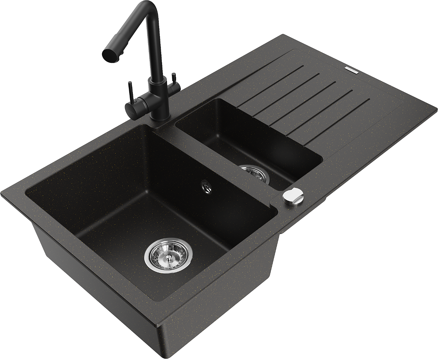 Mexen Matias granitový dřez 1,5-komorový s odkapávačem a kuchyňskou baterií Duero, černý/zlatý metalik - 6502-75-671600-70