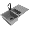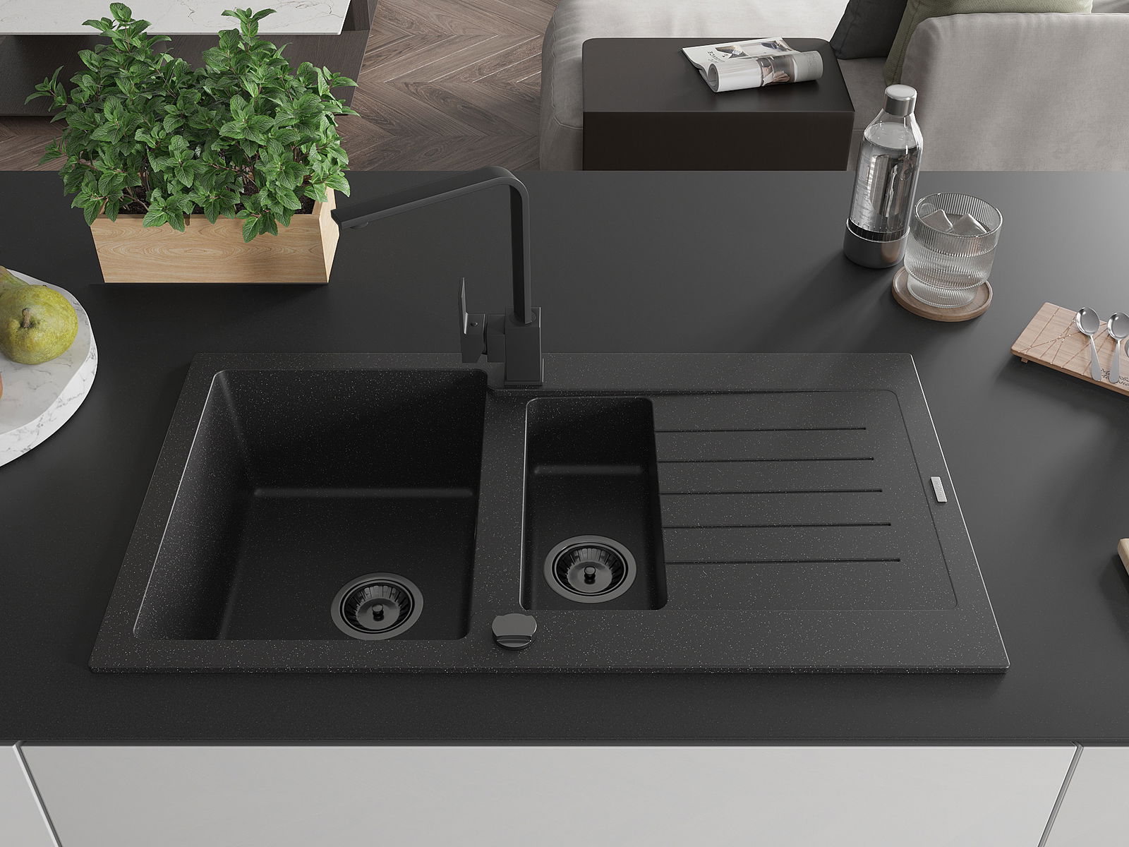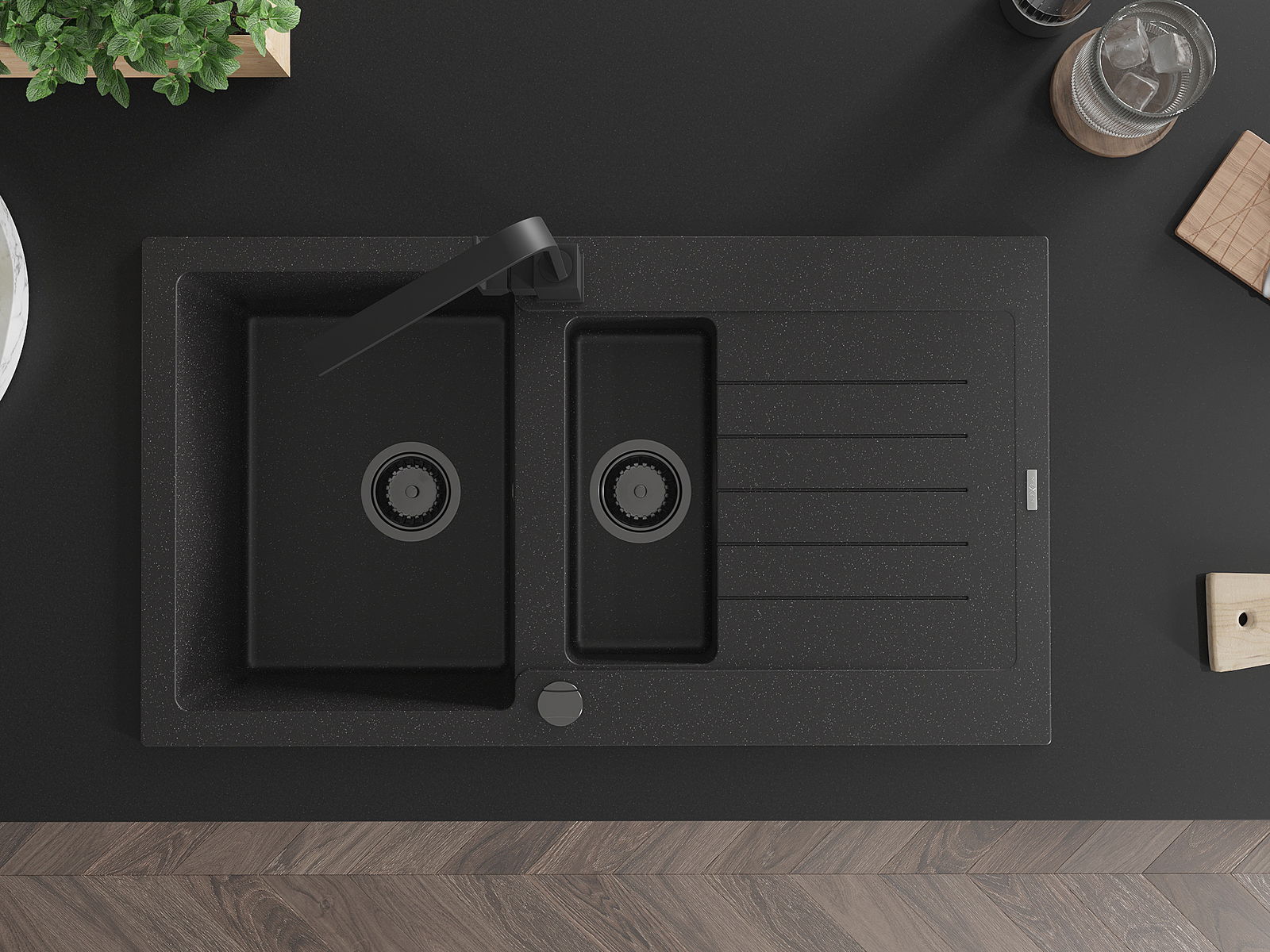 Mexen Matias granitový dřez 1,5-komorový s odkapávačem a kuchyňskou baterií Rita, černá/stříbrná - 6502-73-670300-70-B