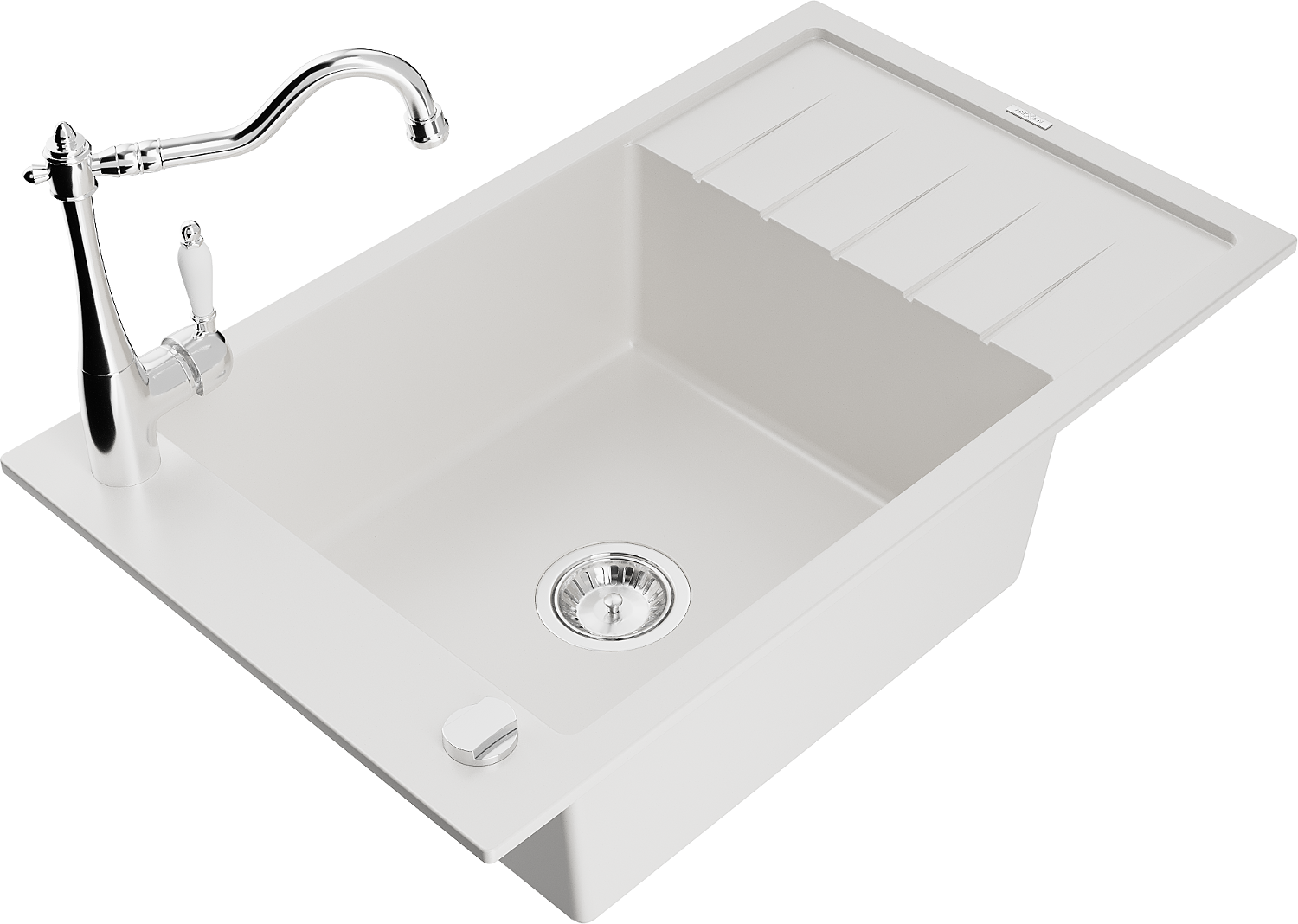 Mexen Elias granitový dřez 1-komorový s odkapávačem a kuchyňskou baterií Carla, bílý - 6511-20-670700-00
