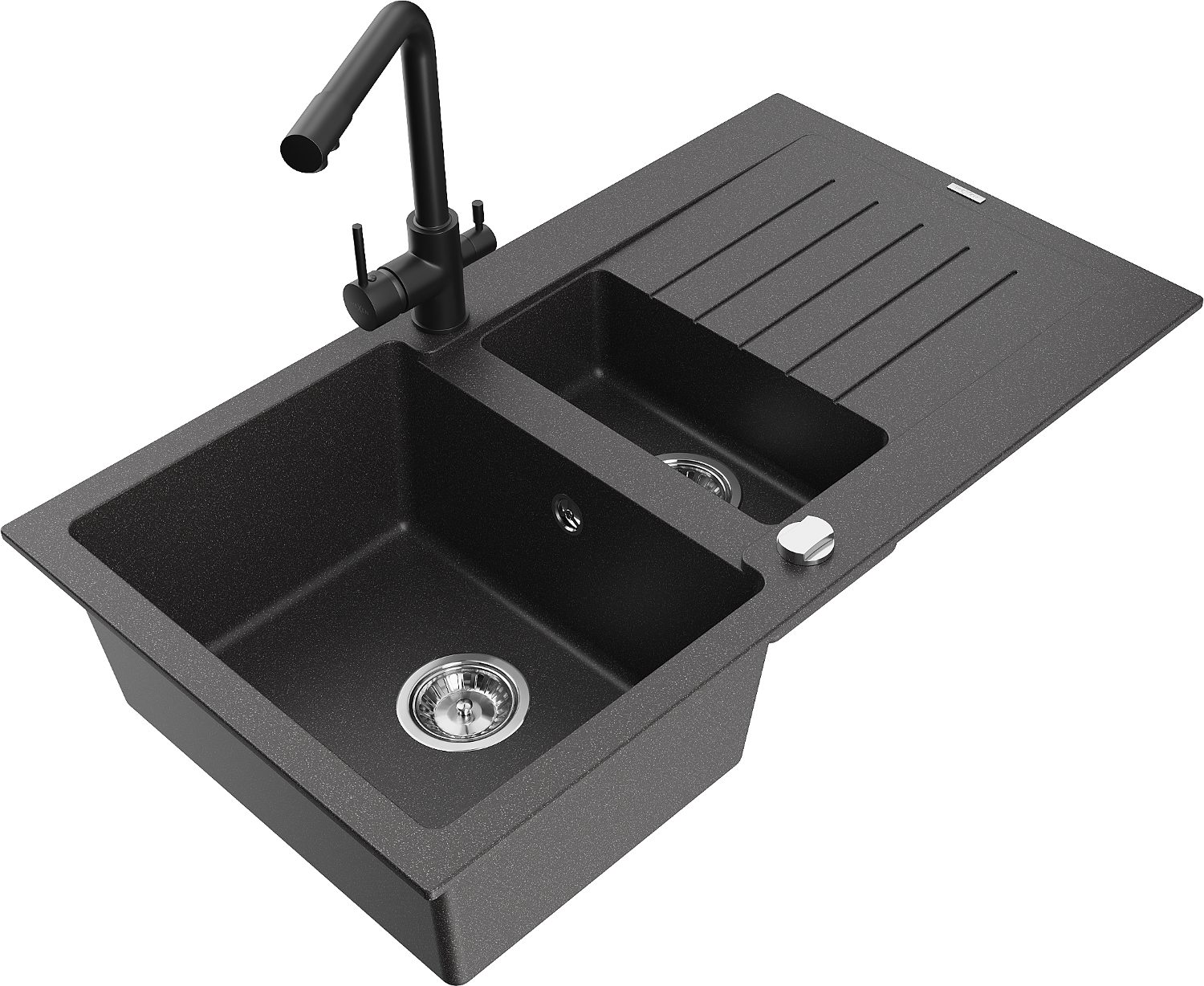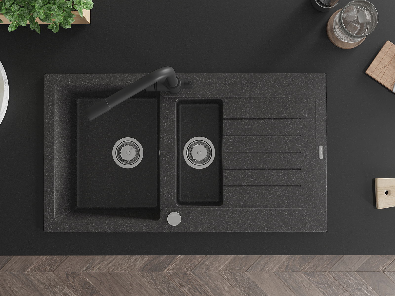 Mexen Matias žulový dřez 1,5-komorový s odkapávačem a kuchyňskou baterií Duero, černý skvrnitý - 6502-76-671600-70