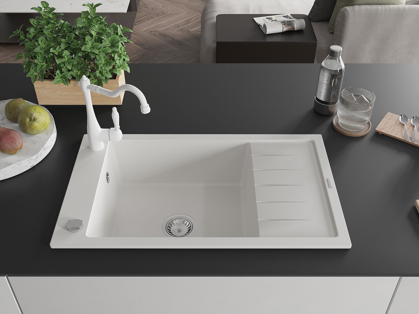 Mexen Elias granitový jednodřez s odkapávačem a kuchyňskou baterií Carla, bílý - 6511-20-670700-20