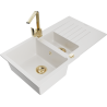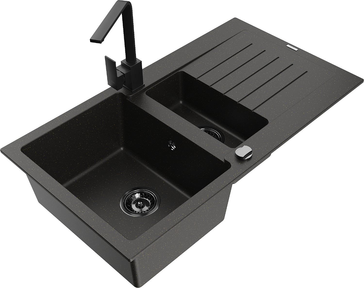 • Mexen Matias granitový dřez 1,5-komorový s odkapávačem a kuchyňskou baterií Rita, černý/zlatý - 6502-75-670300-50-B
