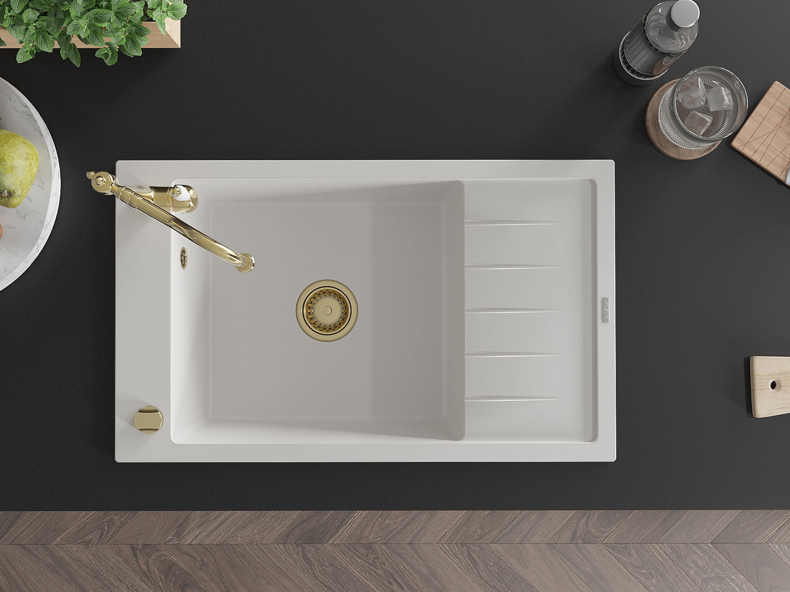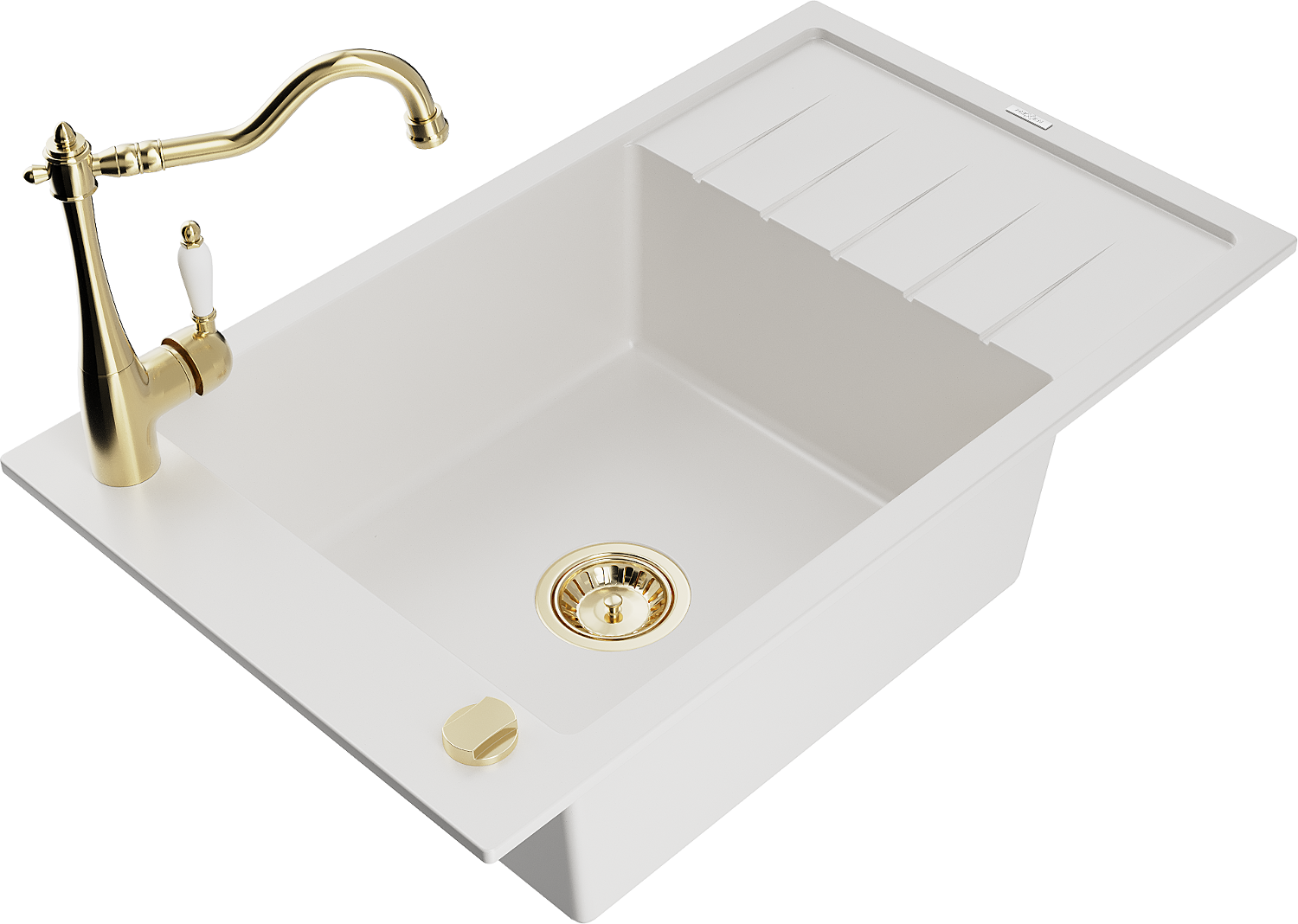 Mexen Elias granitový dřez 1-komorový s odkapávačem a kuchyňskou baterií Carla, bílý - 6511-20-670700-50