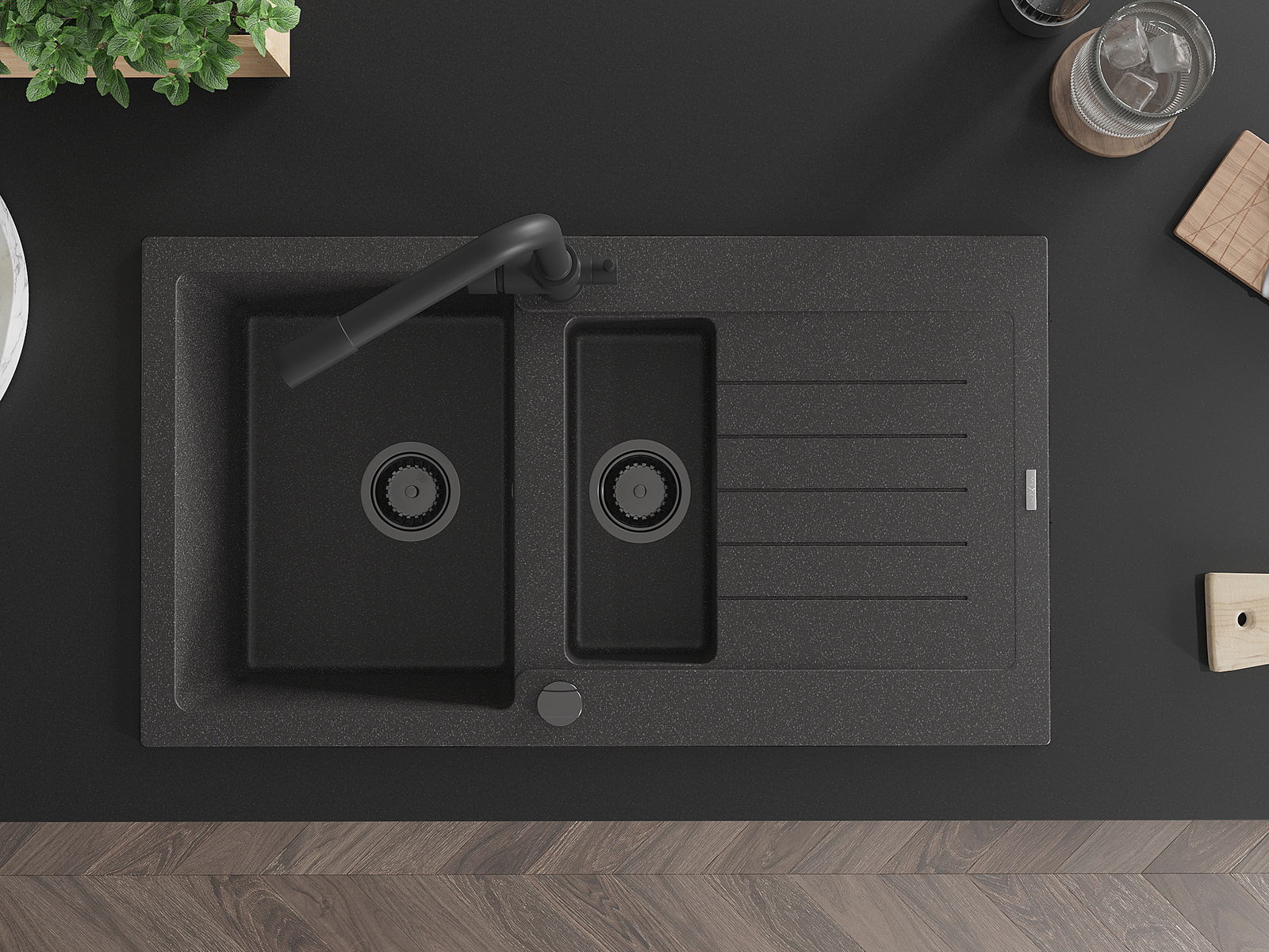 • Mexen Matias granitový dřez 1,5-komorový s odkapávačem a kuchyňskou baterií Duero, černý tečkovaný - 6502-76-671600-70-B