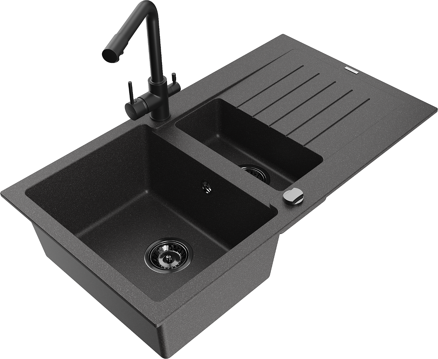 Mexen Matias granitový dřez 1,5-komorový s odkapávačem a kuchyňskou baterií Duero, černý tečkovaný - 6502-76-671600-70-B
