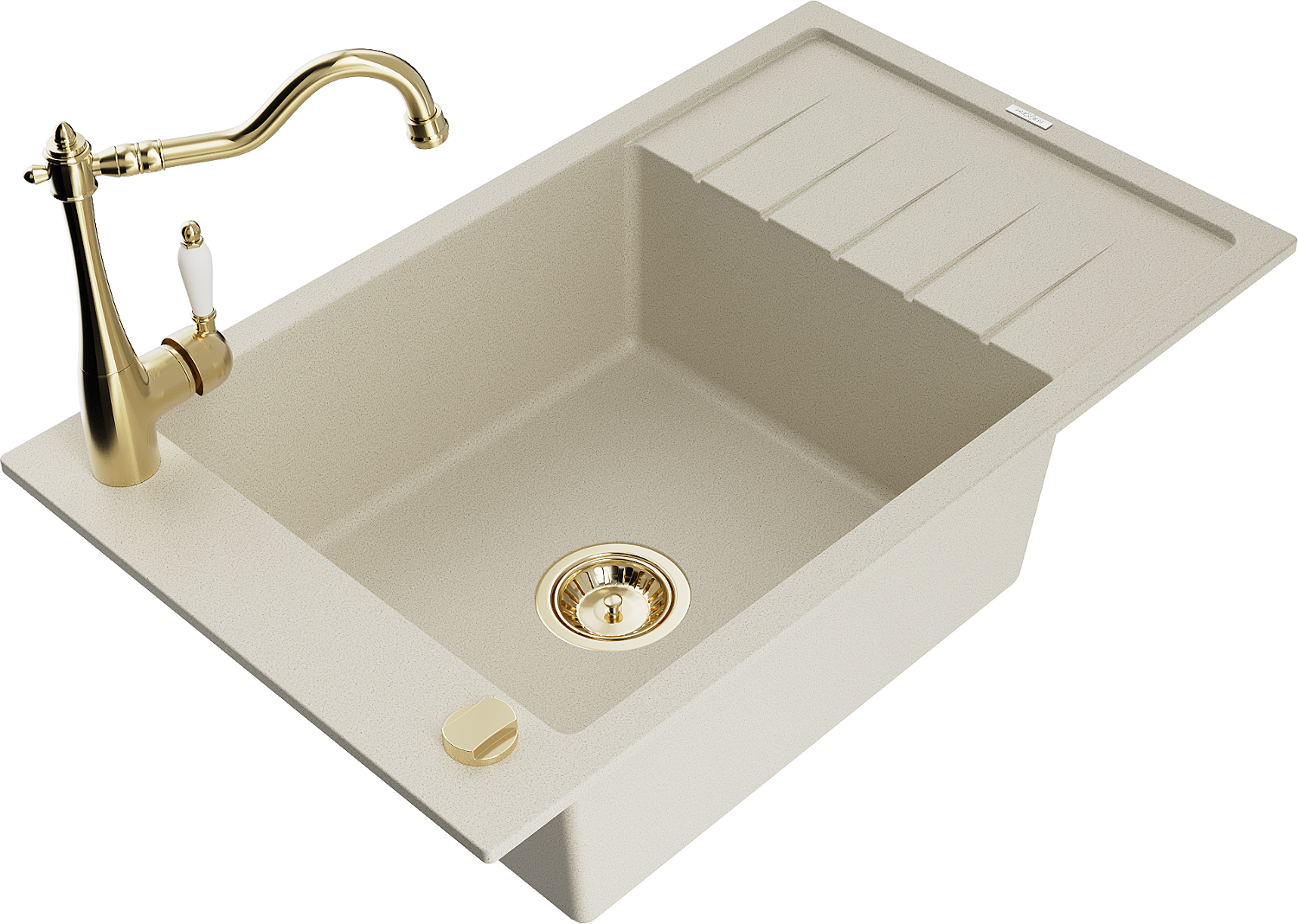 Mexen Elias granitový dřez 1-komorový s odkapávačem a kuchyňskou baterií Carla, béžový - 6511-69-670700-50