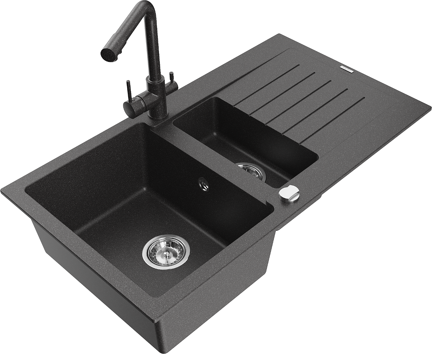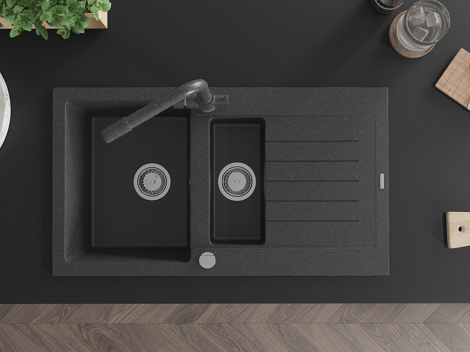 Mexen Matias granitový dřez 1,5-komorový s odkapávačem a kuchyňskou baterií Duero, černý skvrnitý - 6502-76-671600-76