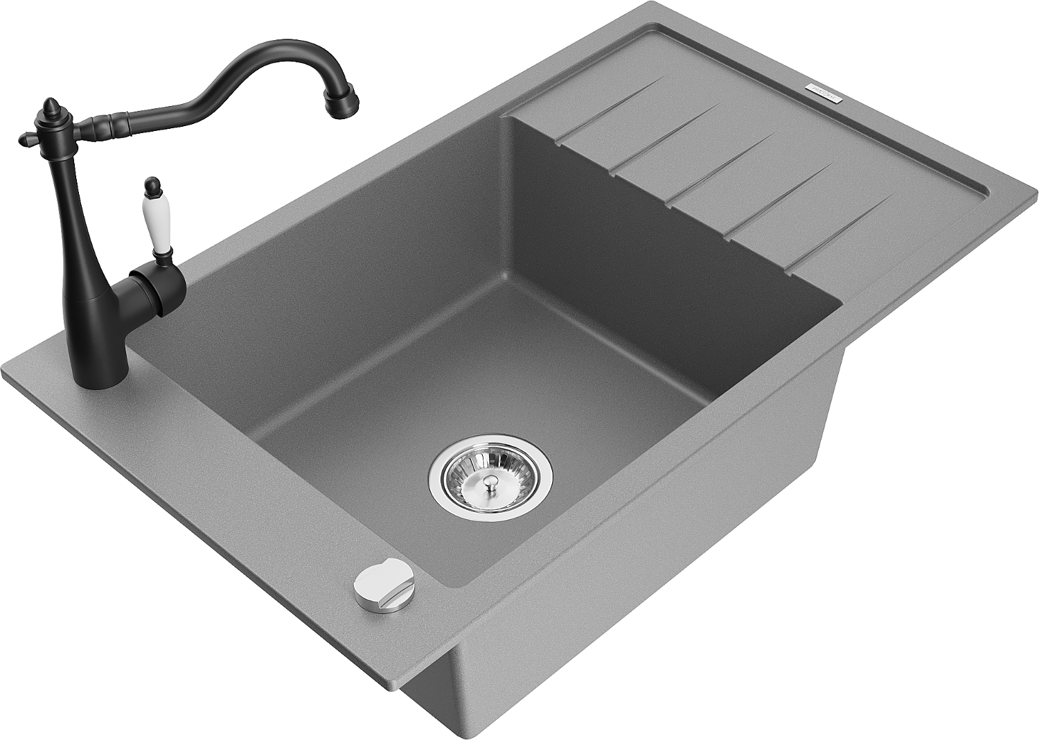 Mexen Elias granitový jednodřez s odkapávačem a kuchyňskou baterií Carla, šedý - 6511-71-670700-70