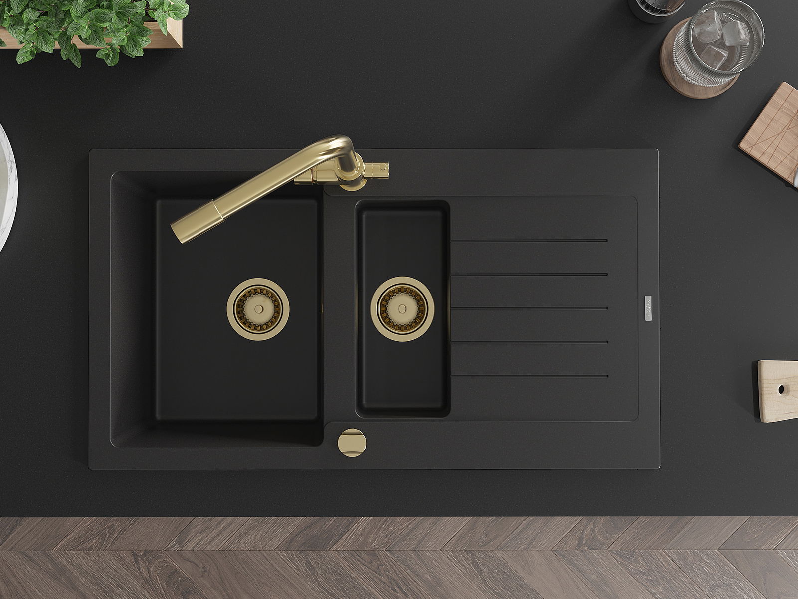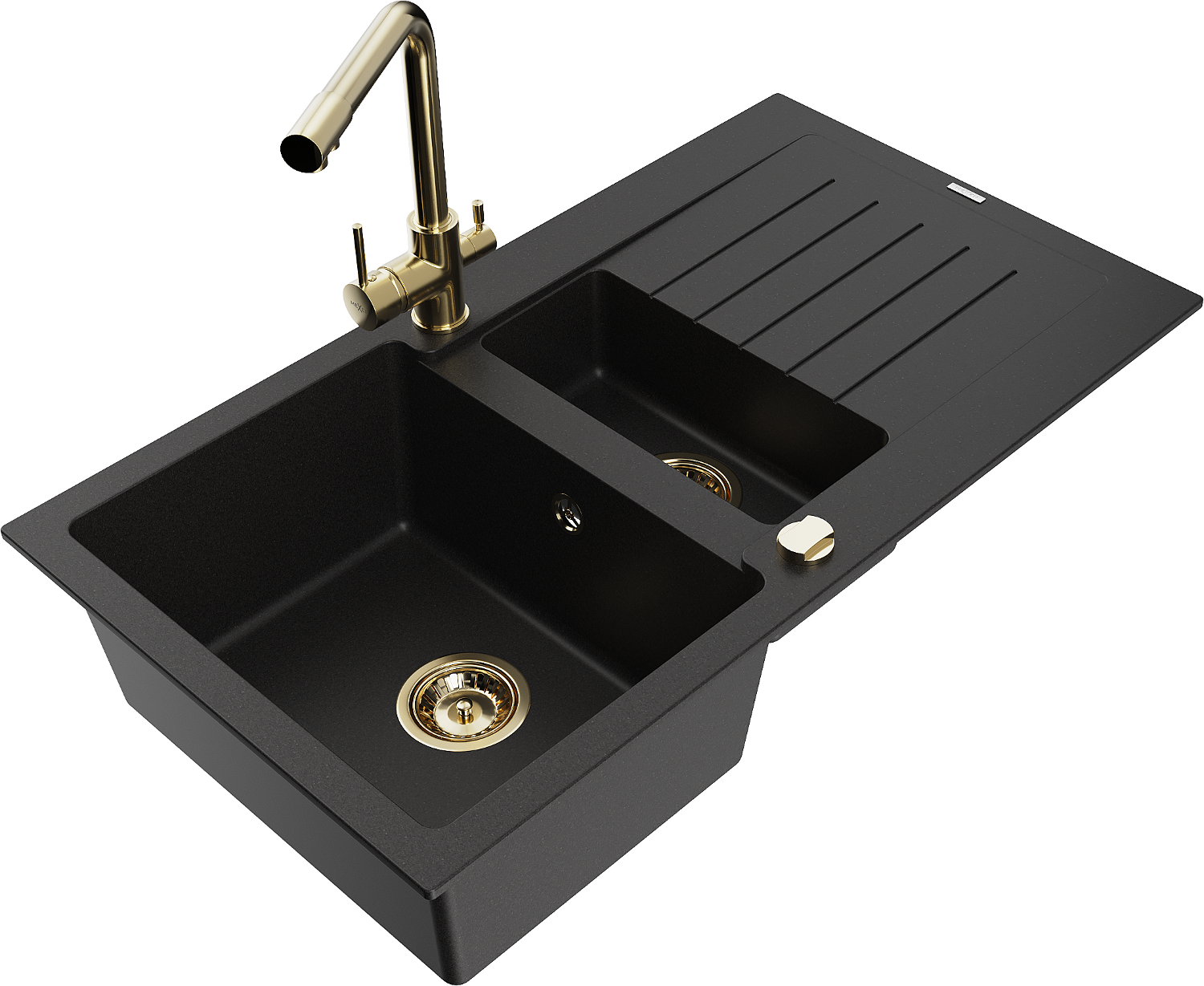 Mexen Matias granitový dřez 1,5-komorový s odkapem a kuchyňskou baterií Duero, černý - 6502-77-671600-50